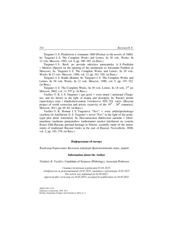 5. Васильев В. К. И. С. Тургенев и его герои в свете утопии и антиутопии // Русский проект исправления мира и художественное творчество ХIХ-ХХ веков: Коллективная монография. М., 2011. С. 65-84.