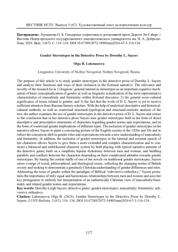 Целью настоящей статьи является изучение гендерных стереотипов в детективной прозе Д. Л. Сэйерс, а также последовательный анализ их функций и способов включения в художественное повествование. Актуальность и новизна исследования обусловлены интересом лингвистов к стереотипам как одному из когнитивных механизмов базовой концептуализации гендера и к языковой актуализации наиболее непрезентативных признаков маскулинности и фемининности в художественном дискурсе, а также общей социально-культурной значимостью вопросов, связанных с гендером, и тем, что творчество Д. Л. Сэйерс остается сравнительно малоизученным в российском литературоведении. С помощью аналитико-описательного и историко-культурного методов, а также контекстного структурно-типологического и структурно-семиотического анализа текста автор анализирует особенности использования гендерных стереотипов в детективной прозе Д. Л. Сэйерс и приходит к выводу, что в детективных романах писательницы гендерные стереотипы используются как в виде прямых дескриптивных и прескриптивных высказываний персонажей относительно гендерных норм и ожиданий, так и в виде контекстуальных гендерных импликатур разного типа, выполняя при этом целый ряд функций. Прежде всего включение гендерных стереотипов в повествование позволяет Сэйерс нарисовать убедительную картину английского социума 1920-30-х гг. и характерный для него сдвиг гендерных ролей и ожиданий в сторону нового понимания маскулинности и фемининности. Кроме того, включение гендерных стереотипов во внутреннюю и внешнюю речь героев позволяет Сэйерс дать им более развернутую и сложную характеризацию и выстроить систему персонажей, не только играя с типичными для детективного жанра нарративными шаблонами, выстроенными на основе упрощенной биполярной дихотомии между мужчинами и женщинами, но и обозначая параллели и конфликты между персонажами в зависимости от их многообразного и противоречивого отношения к гендерным стереотипам. Закладывая традиционные гендерные стереотипы в сюжетную основу одного из своих романов, Сэйерс поднимает целый ряд социальных, философских и богословских проблем, отражая меняющиеся нормы британского общества и размышляя о подлинно христианском понимании гендерных различий и ролей. Решая гендерный вопрос в русле характерной для ее творчества «субверсивной ортодоксии», Сэйерс постулирует важность подлинно равных и гармоничных взаимоотношений между мужчинами и женщинами и в образах своих протагонистов воплощает свою интерпретацию библейского взгляда на маскулинность / фемининность и связанные с ними гендерные нормы и ожидания.