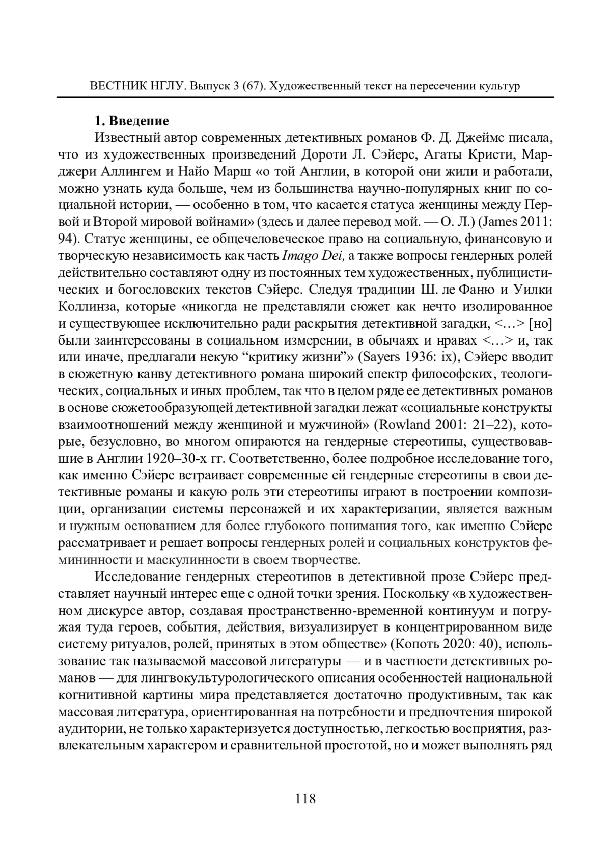Известный автор современных детективных романов Ф. Д. Джеймс писала, что из художественных произведений Дороти Л. Сэйерс, Агаты Кристи, Марджери Аллингем и Найо Марш «о той Англии, в которой они жили и работали, можно узнать куда больше, чем из большинства научно-популярных книг по социальной истории, — особенно в том, что касается статуса женщины между Первой и Второй мировой войнами» (здесь и далее перевод мой. — О. Л.) (James 2011: 94). Статус женщины, ее общечеловеческое право на социальную, финансовую и творческую независимость как часть Imago Dei, а также вопросы гендерных ролей действительно составляют одну из постоянных тем художественных, публицистических и богословских текстов Сэйерс. Следуя традиции Ш. ле Фаню и Уилки Коллинза, которые «никогда не представляли сюжет как нечто изолированное и существующее исключительно ради раскрытия детективной загадки, <…> [но] были заинтересованы в социальном измерении, в обычаях и нравах <…> и, так или иначе, предлагали некую “критику жизни”» (Sayers 1936: ix), Сэйерс вводит в сюжетную канву детективного романа широкий спектр философских, теологических, социальных и иных проблем, так что в целом ряде ее детективных романов в основе сюжетообразующей детективной загадки лежат «социальные конструкты взаимоотношений между женщиной и мужчиной» (Rowland 2001: 21–22), которые, безусловно, во многом опираются на гендерные стереотипы, существовавшие в Англии 1920–30-х гг.