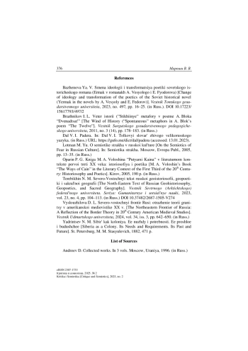 1. Баженова Я. В. Смена идеологии и трансформация поэтики советского исторического романа (Ермак в романах А. Веселого и Е. Федорова) // Вестник Том. гос. ун-та. 2023. № 497. С. 16-25. DOI: 10.17223/15617793/497/2