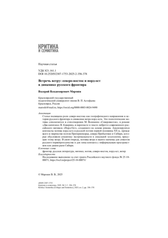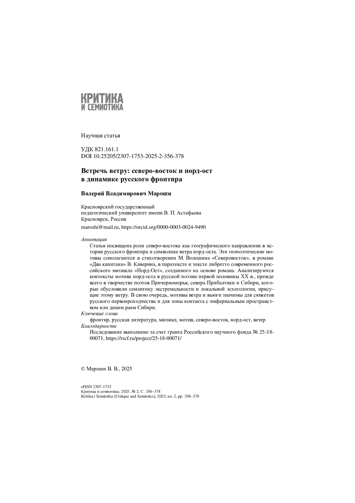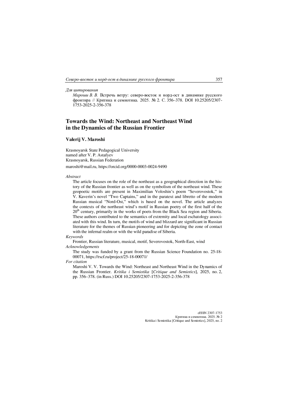 Статья посвящена роли северо-востока как географического направления в истории русского фронтира и символике ветра норд-оста. Эти геопоэтические мотивы сополагаются в стихотворении М. Волошина «Северовосток», в романе «Два капитана» В. Каверина, в паратексте и тексте либретто современного российского мюзикла «Норд-Ост», созданного на основе романа. Анализируются контексты мотива норд-оста в русской поэзии первой половины ХХ в., прежде всего в творчестве поэтов Причерноморья, севера Прибалтики и Сибири, которые обусловили семантику экстремальности и локальной эсхатологии, присущие этому ветру. В свою очередь, мотивы ветра и вьюги значимы для сюжетов русского первопроходчества и для зоны контакта с инфернальным пространством или диким раем Сибири.