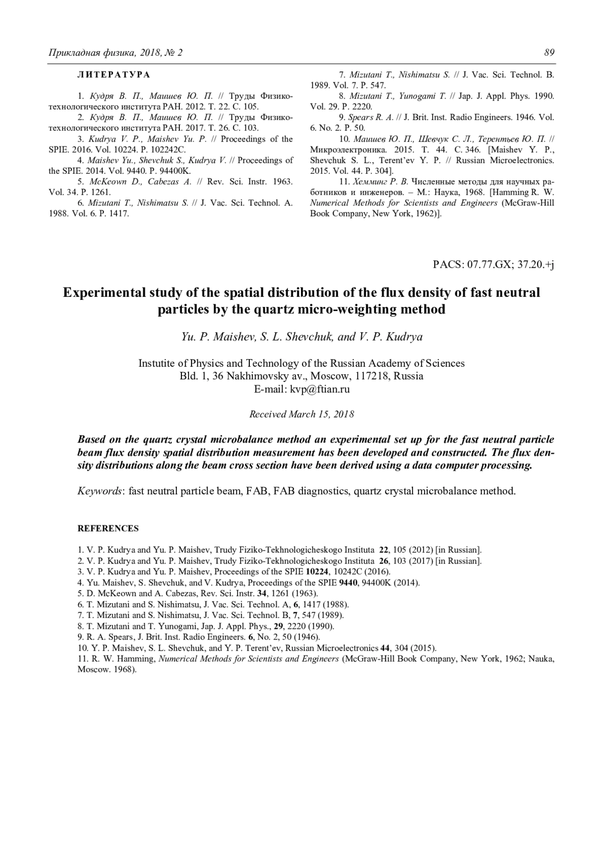 Yu. P. Maishev, S. L. Shevchuk, and V. P. Kudrya Experimental study of the spatial distribution of the flux density of fast neutral particles by the quartz micro-weighting method 86