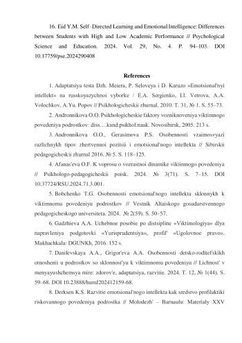 16. Eid Y.M. Self-Directed Learning and Emotional Intelligence: Differences between Students with High and Low Academic Performance // Psychological Science and Education. 2024. Vol. 29, No. 4. P. 94-103. DOI: 10.17759/pse.2024290408 EDN: OJHKIP