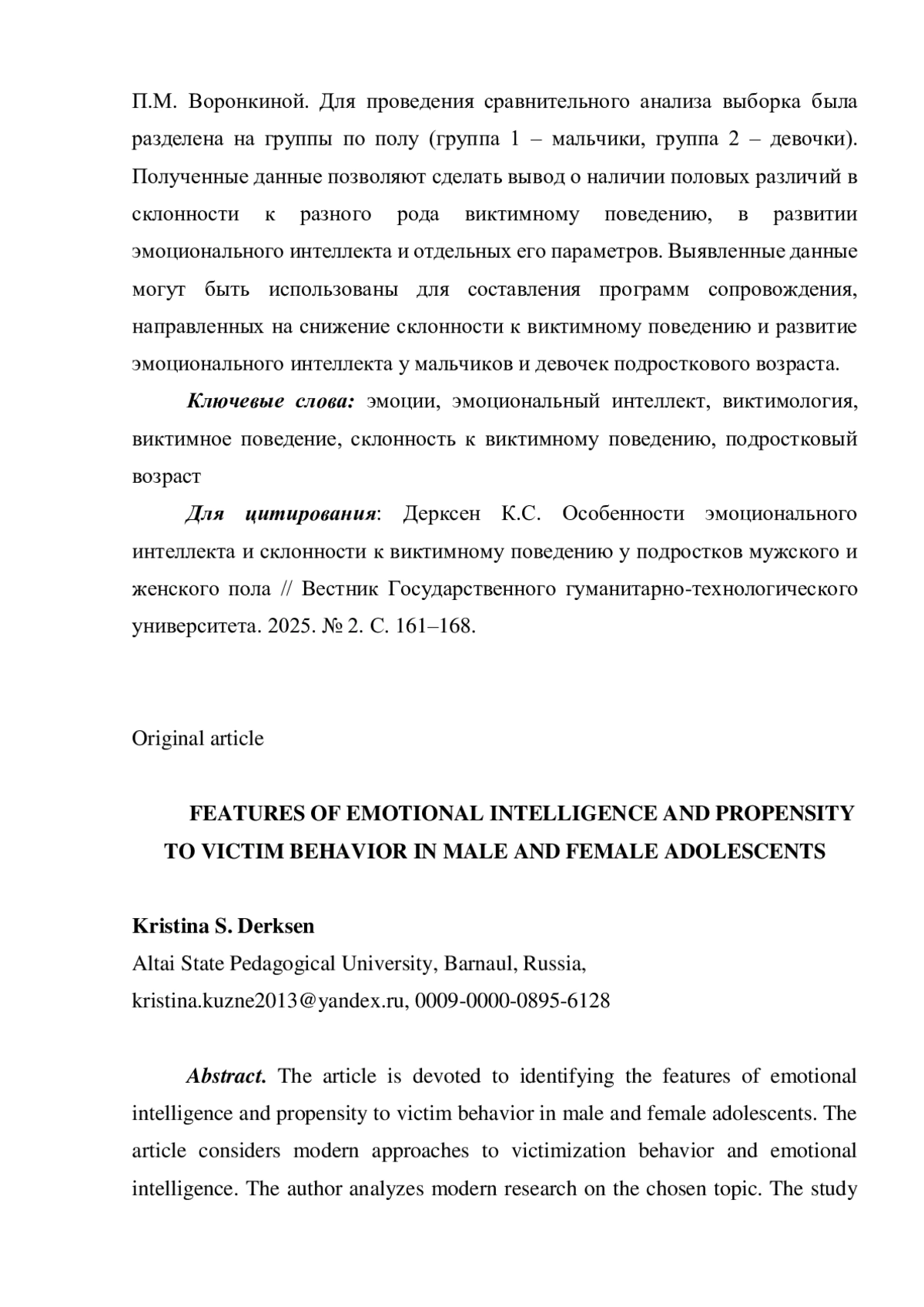 5. Бобченко Т.Г. Особенности эмоционального интеллекта склонных к виктимному поведению подростков // Вестник Алтайского государственного педагогического университета. 2024. № 2(59). С. 50-57.