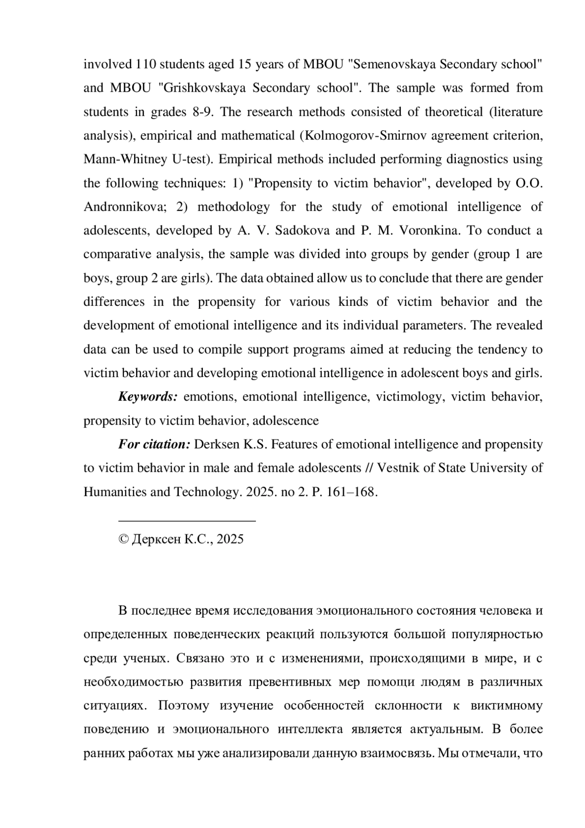 Статья посвящена выявлению особенностей эмоционального интеллекта и склонности к виктимному поведению у подростков мужского и женского пола. В статье рассматриваются современные подходы к виктимному поведению, эмоциональному интеллекту. Автор анализирует современные исследования по выбранной проблематике. В исследовании приняли участие 110 учащихся в возрасте 15 лет МБОУ «Семеновская СОШ» и МБОУ «Гришковская СОШ». Выборка была сформирована из учащихся 8-9 классов. Методы исследования состояли из теоретических (анализ литературы), эмпирических и математических (критерий согласия Колмогорова-Смирнова, U-критерия Манна-Уитни). Эмпирические методы включали проведение диагностики с использованием следующих методик: 1) «Склонность к виктимному поведению», разработанная О. О. Андронниковой; 2) методика исследования эмоционального интеллекта подростков, разработанная А. В. Садоковой и П. М. Воронкиной. Для проведения сравнительного анализа выборка была разделена на группы по полу (группа 1 - мальчики, группа 2 - девочки). Полученные данные позволяют сделать вывод о наличии половых различий в склонности к разного рода виктимному поведению, в развитии эмоционального интеллекта и отдельных его параметров. Выявленные данные могут быть использованы для составления программ сопровождения, направленных на снижение склонности к виктимному поведению и развитие эмоционального интеллекта у мальчиков и девочек подросткового возраста.