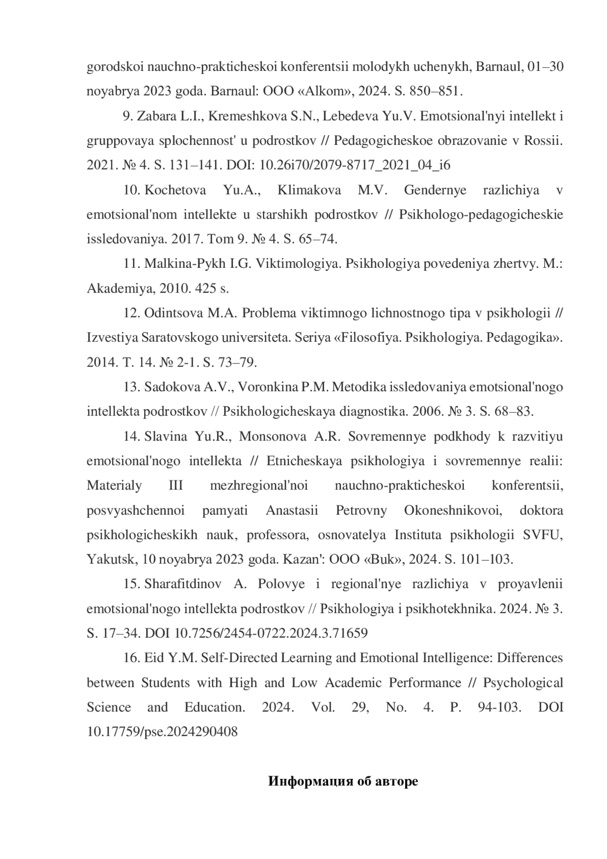 13. Садокова А.В., Воронкина П.М. Методика исследования эмоционального интеллекта подростков // Психологическая диагностика. 2006. № 3. С. 68-83.