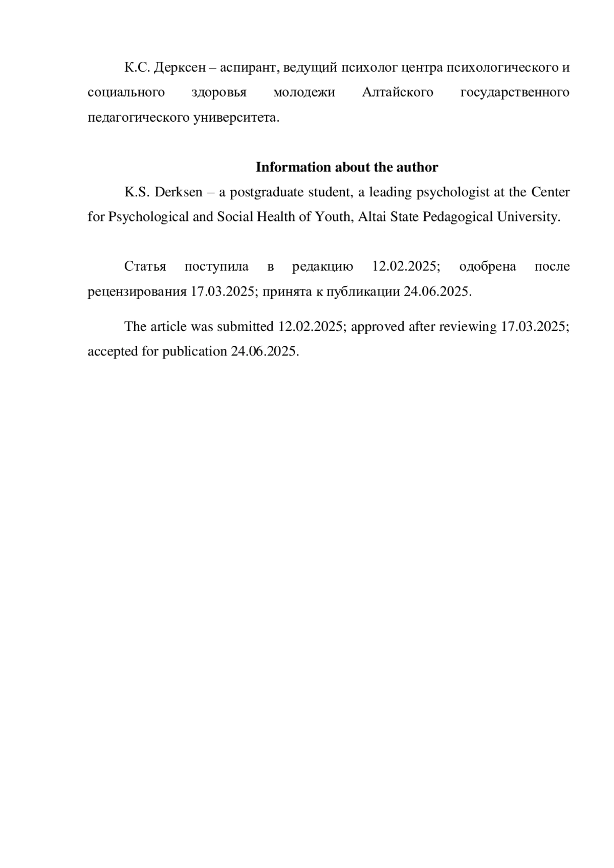 4. Афанасьева О.Ф. К вопросу о возрастной динамике виктимного поведения // Психолого-педагогический поиск. 2024. № 3(71). С. 7-15. DOI: 10.37724/RSU.2024.71.3.001 EDN: PQUJLT