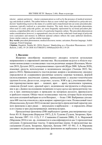 Жанровое своеобразие медицинского дискурса остается актуальным направлением в современной лингвистике. Исследования ведутся в области изучения монокодовых и поликодовых текстов различных жанров (Косицкая, Матюхин 2018; Дугалич 2023), коммуникативных стратегий (Жура 2008; Зубкова 2020), языковых средств, используемых в медицинском дискурсе (Ткачева 2022; Stepanova 2022). Принадлежность текстов разных жанров к медицинскому дискурсу определяется их содержанием (различные аспекты здоровья человека), формой (использованием лексических единиц, принадлежащих к лексико-тематическим группам болезнь, физиология, лекарство, гигиена, ЗОЖ и др.), участниками общения (преимущественно врач — пациент, врач — врач), включением терминов, символов (белый халат, красный крест, медицинские инструменты и оборудование и др.). Данное исследование посвящено почерку врача как прецедентному тексту в трех лингвокультурах и проведено на материале русского, французского и арабского языков. Общее число поликодовых текстов, которые были получены методом сплошной выборки из сети Интернет, — более 1300. Выбранные для анализа 600 текстов относятся к двум жанрам: карикатура и мем. Поликодовый текст (Новоспасская, Дугалич 2022) позволяет рассмотреть прецедентный характер данного феномена в двух рядах — визуальном и вербальном — и определить общее в его оценке в трех рассматриваемых лингвокультурах.