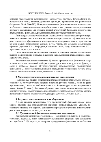 Цель статьи - оценить феномен почерк врача, который частотно используется в комических поликодовых жанрах как прецедентный, и рассмотреть семантику его употребления в контексте карикатуры и мема в трех лингвокультурах: русской, арабской и французской. Исследование посвящено описанию поликодовых текстов медицинского дискурса в различных лингвокультурах и выполнено на массиве поликодовых сообщений общим объемом более 1300 текстов. Принадлежность текстов различных жанров определяется их тематикой (коммуникация врач - пациент и врач - врач), наличием медицинской терминологии и медицинской символики. Автор полагает, что понимание феномена почерк врача как невербального знака, который в поликодовом тексте вербализуется, получает статус символа и трансформируется в иконический прецедентный феномен, реализованный как прецедентная ситуация. Исследование показало, что прецедентные феномены, которые частотно используются в комических поликодовых жанрах, чаще представлены национальными, понятными носителю конкретной лингвокультуры. Рассматриваемый прецедентный феномен, однако, является наднациональным, поскольку его употребление в вербальном и визуальном ряду поликодового текста карикатуры и мема характеризуется идентичной интенцией автора, формирует схожие контексты и имеет близкие смыслы.