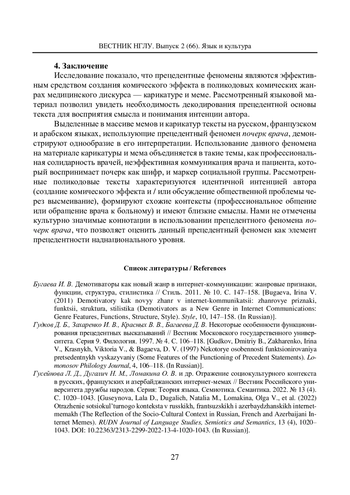 3. Гусейнова Л. Д., Дугалич Н. М., Ломакина О. В. и др. Отражение социокультурного контекста в русских, французских и азербайджанских интернет-мемах // Вестник Российского университета дружбы народов. Серия: Теория языка. Семиотика. Семантика. 2022. № 13 (4). C. 1020-1043. EDN: INAPKU
