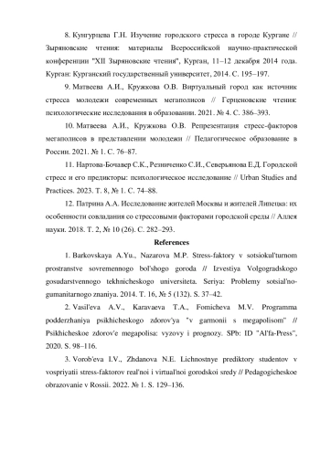 10. Матвеева А.И., Кружкова О.В. Репрезентация стресс-факторов мегаполисов в представлении молодежи // Педагогическое образование в России. 2021. № 1. С. 76-87.