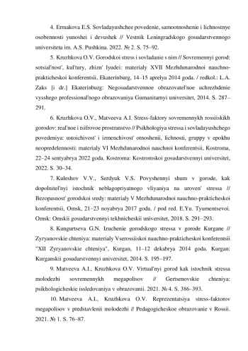 6. Кружкова О.В., Матвеева А.И. Стресс-факторы современных российских городов: реальное и цифровое пространство // Психология стресса и совладающего поведения: устойчивость и изменчивость отношений, личности, группы в эпоху неопределенности: материалы VI Международной научной конференции, Кострома, 22-24 сентября 2022 года. Кострома: Костромской государственный университет, 2022. С. 30-34. EDN: IQGYGQ