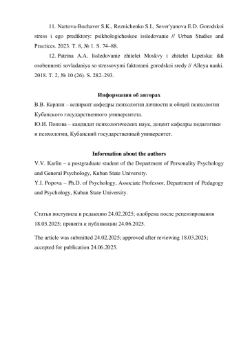 11. Нартова-Бочавер С.К., Резниченко С.И., Северьянова Е.Д. Городской стресс и его предикторы: психологическое исследование // Urban Studies and Practices. 2023. Т. 8, № 1. С. 74-88. EDN: RQMRMJ