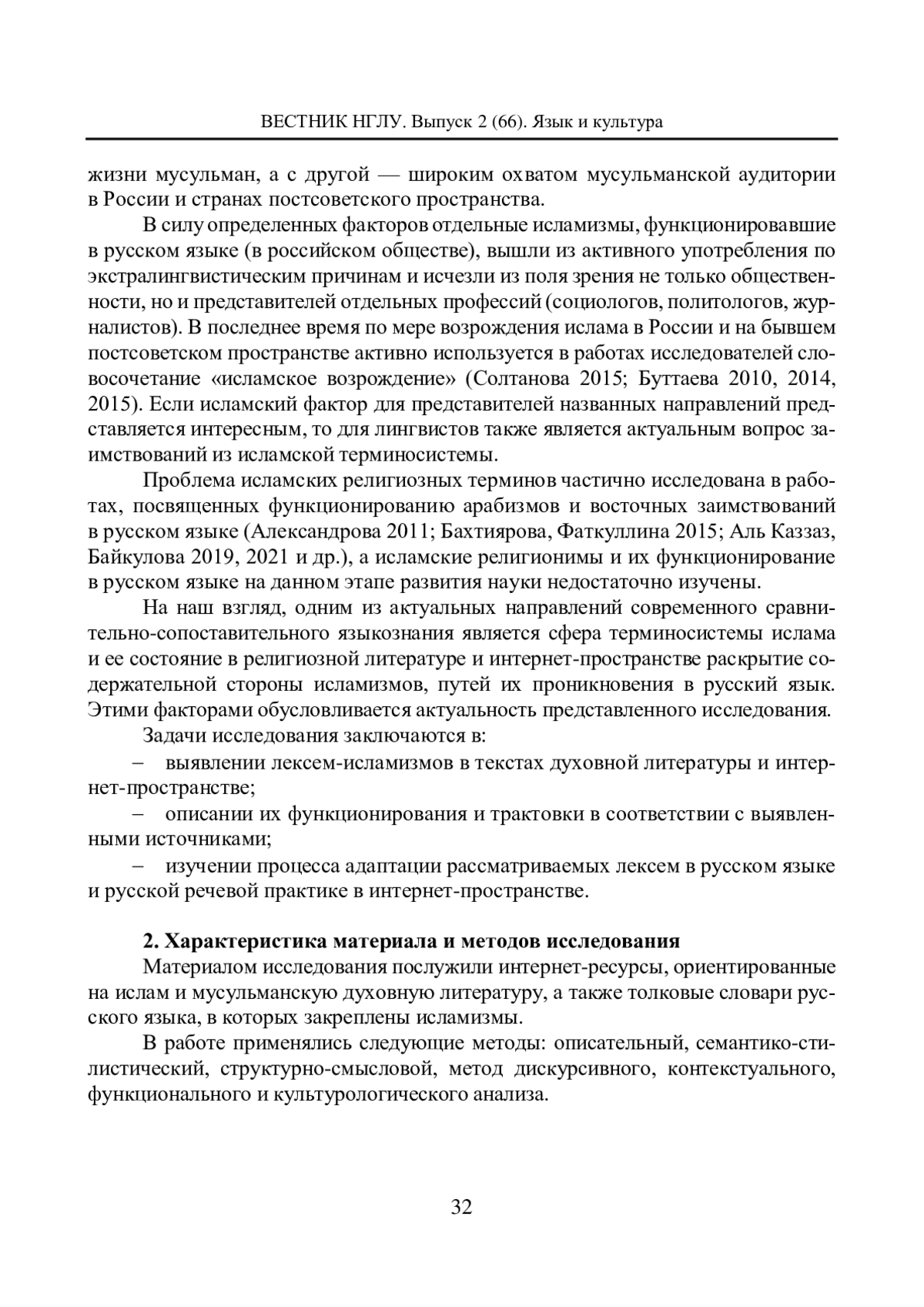 В последние десятилетия отмечается тенденция интереса и обращения многих народов к своим национальным истокам, в том числе к религии, что находит отражение в распространении, возвращении в обиход и в язык религиозной лексики. Анализ заимствованных в русский язык лексем ислама показывает активный процесс адаптации данных теонимов к русскому тексту религиозного дискурса. Наряду с духовной литературой, опубликованной на русском языке, одним из основных источников пополнения русского языка теологической лексикой ислама являются интернет-ресурсы: специализированные сайты, соцсети, «Ютьюб», интернет-СМИ. Цель данной статьи - рассмотреть процесс адаптации заимствований и возрождения отдельных мусульманских религионимов в русском языке. Основными источниками изучения функционирования исламизмов в интернет-пространстве являются различные интернет-ресурсы как религиозного, так светского и новостного содержания. Функционирование данных религионимов изучалось с использованием описательного метода.