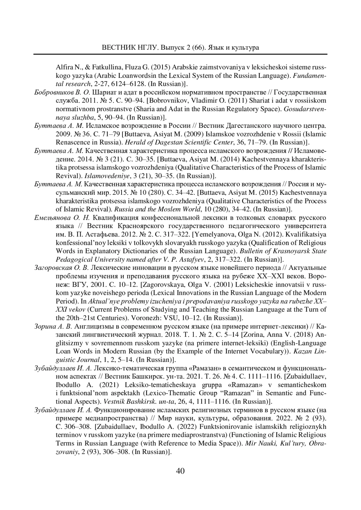 13. Зубайдуллаев И. А. Лексико-тематическая группа “Рамазан” в семантическом и функциональном аспектах // Вестник Башкирск. ун-та. 2021. Т. 26. № 4. С. 1111-1116. EDN: RZJSIX
