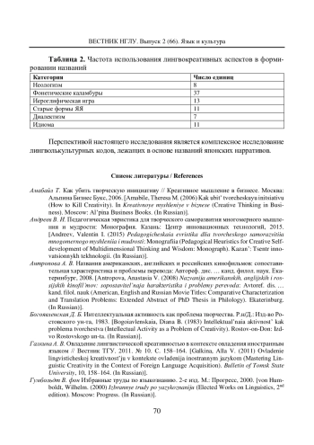9. Ирисханова О. К. О понятии креативности и его роли в метаязыке лингвистических описаний // Когнитивные исследования языка. 2009. № 5. С. 158-171. EDN: PVERTD