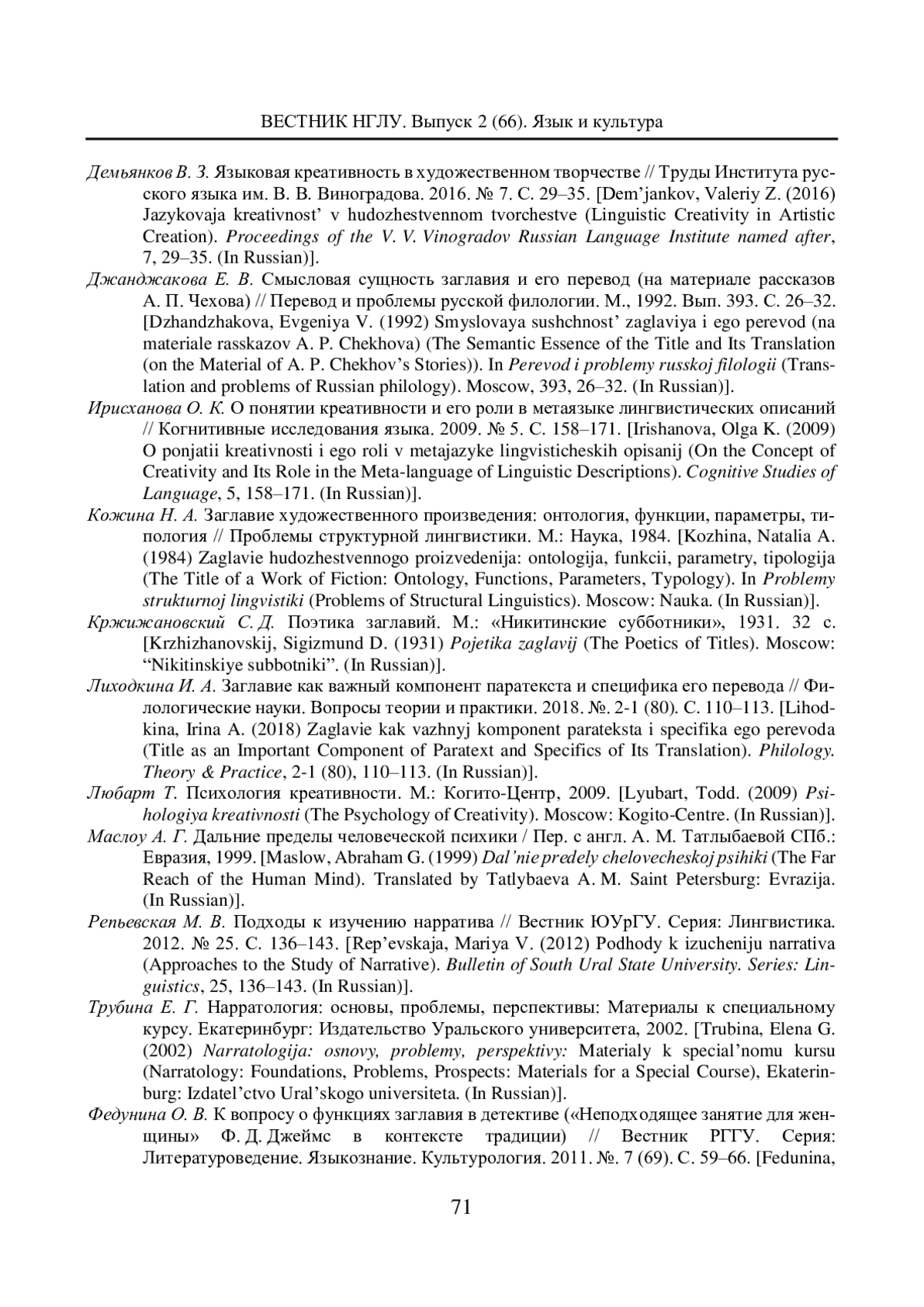 12. Лиходкина И. А. Заглавие как важный компонент паратекста и специфика его перевода // Филологические науки. Вопросы теории и практики. 2018. №. 2-1 (80). С. 110-113. EDN: YODNKJ