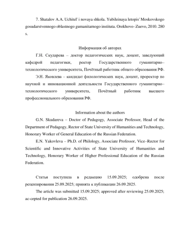 7. Шаталов А.А. Учитель и новая школа. Юбилейная летопись Московского государственного областного гуманитарного института. Орехово-Зуево, 2010. 280 с.