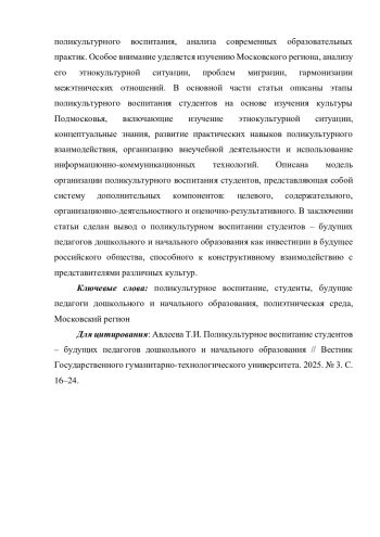 1. Авдеева Т.И. Поликультурное воспитание. Часть 1. Теория и практика в современной образовательной организации: учебное пособие. Орехово-Зуево: ГГТУ, 2025. 112 с.