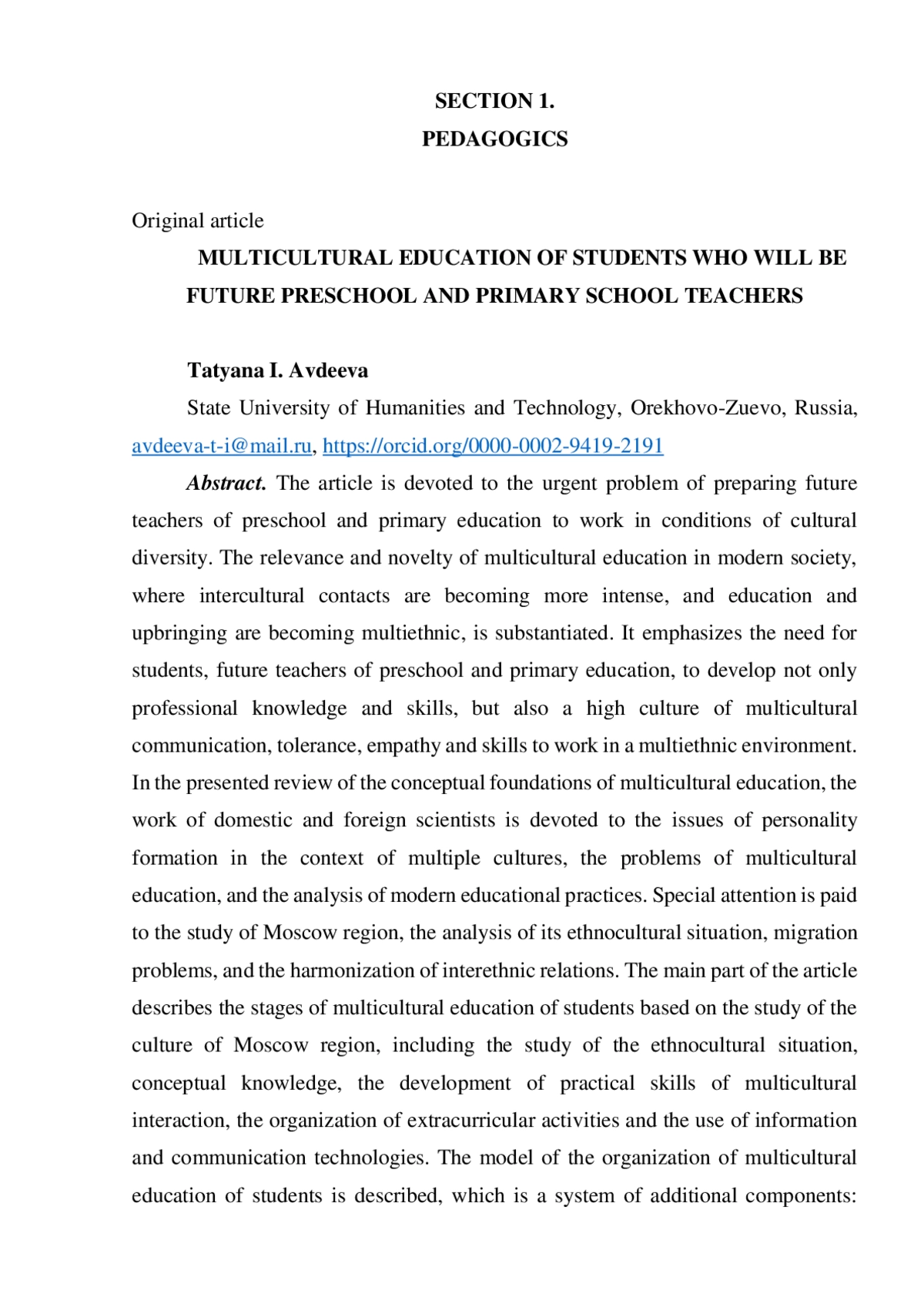 В основной части статьи описаны этапы поликультурного воспитания студентов на основе изучения культуры Подмосковья, включающие изучение этнокультурной ситуации, концептуальные знания, развитие практических навыков поликультурного взаимодействия, организацию внеучебной деятельности и использование информационно-коммуникационных технологий. Описана модель организации поликультурного воспитания студентов, представляющая собой систему дополнительных компонентов: целевого, содержательного, организационно-деятельностного и оценочно-результативного.