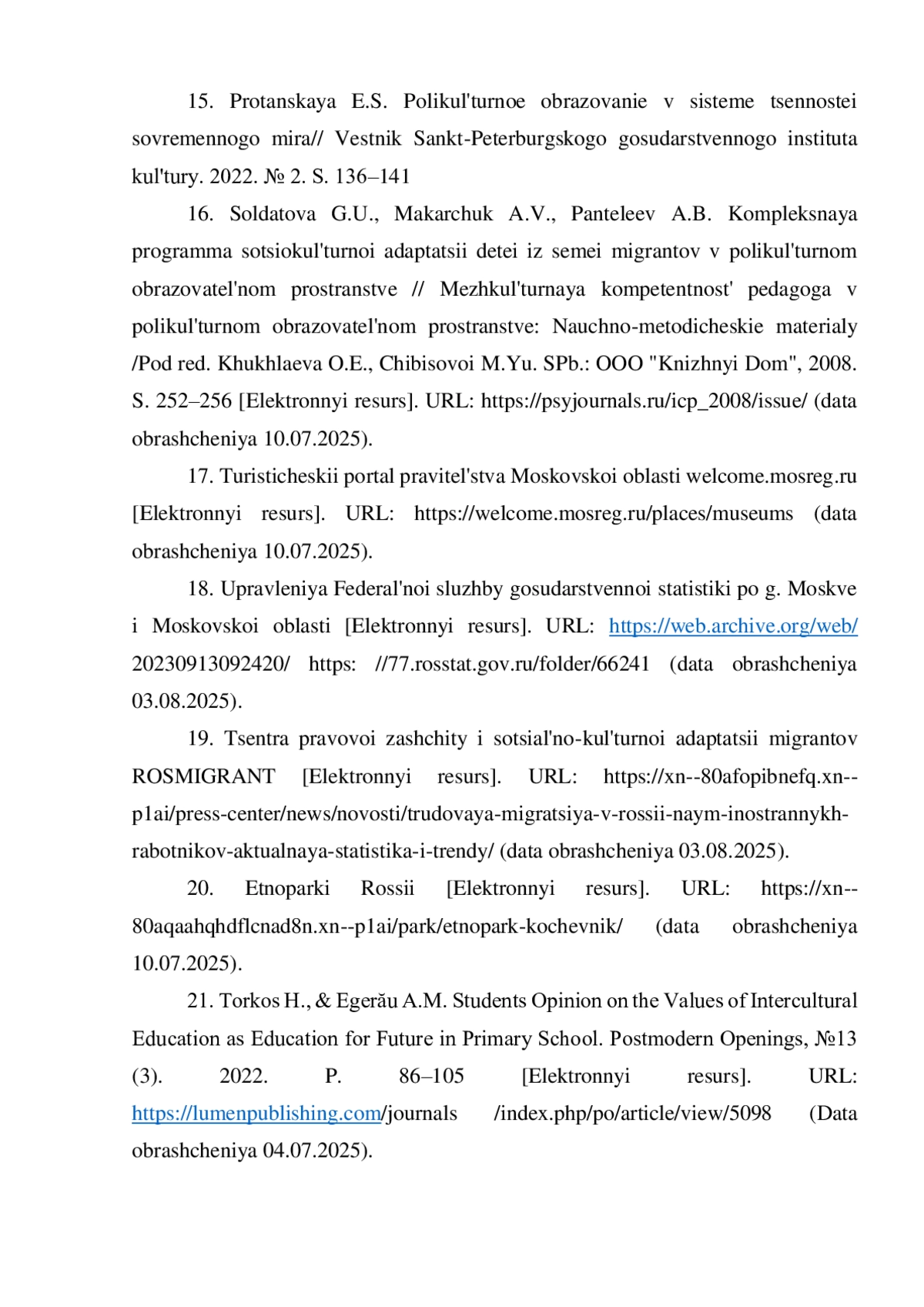 21. Torkos H., & Egerău A. M. Students Opinion on the Values of Intercultural Education as Education for Future in Primary School. Postmodern Openings, №13 (3). 2022. P. 86-105 [Электронный ресурс]. URL: https://lumenpublishing.com/journals/index.php/po/article/view/5098(Датаобращения04.07.2025). EDN: ZSREVA