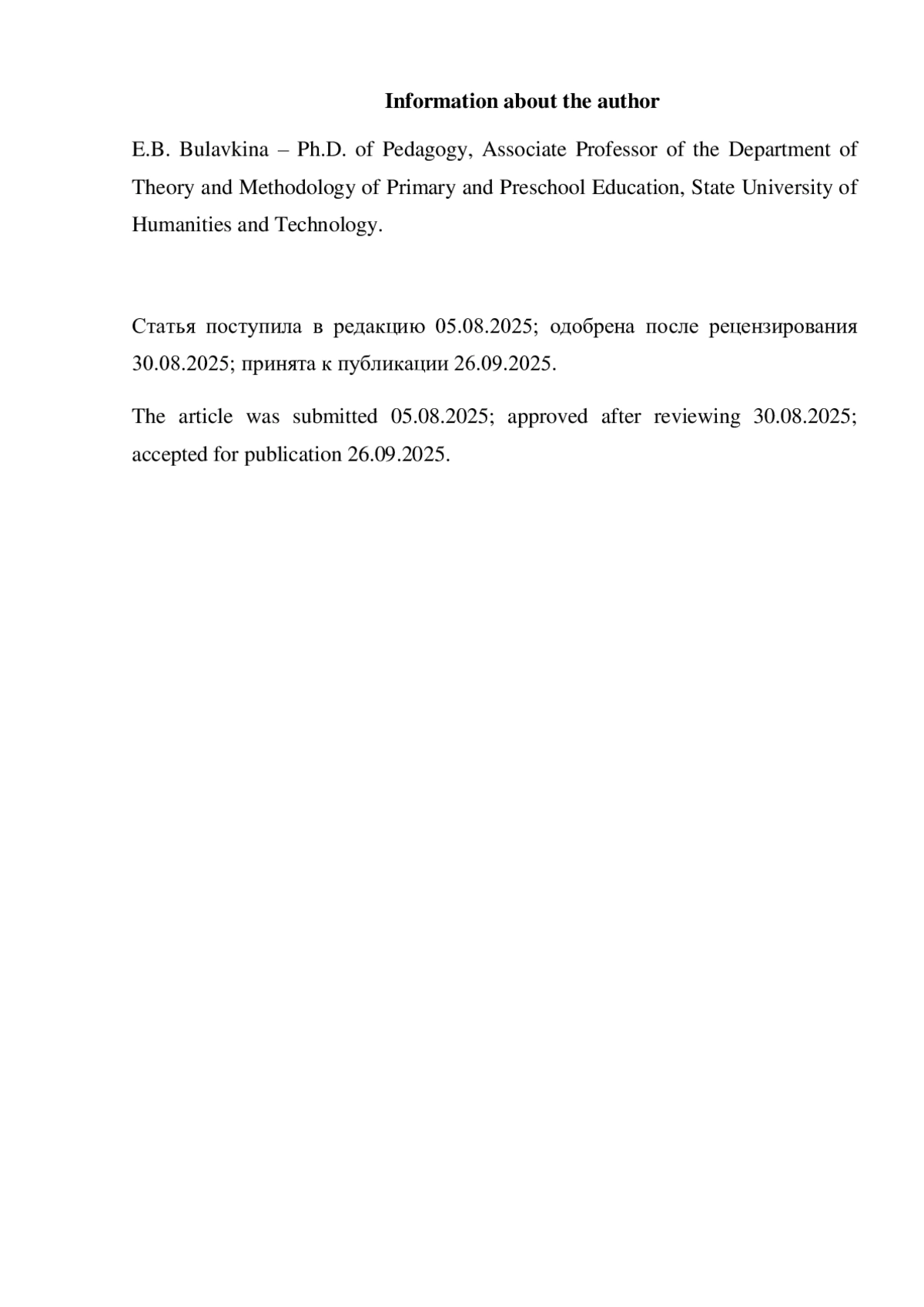 2. Булавкина Е.Б., Тимохина Т.В. Развитие словаря младших школьников // Вестник Государственного гуманитарно-технологического университета. 2023. № 3. С. 15-20. EDN: LKWMBF