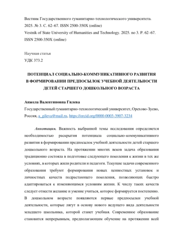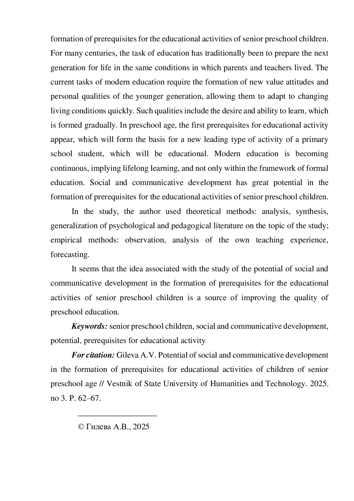 4. Гилева А.В., Милькевич О.А. Оценка качества формирования готовности детей старшего дошкольного возраста к обучению в начальной школе // Вестник педагогических наук. 2024. № 1. С. 200-205. EDN: LSSJYW