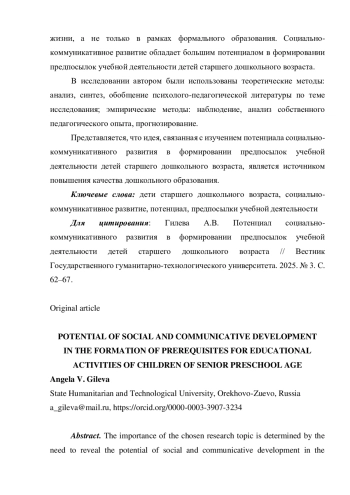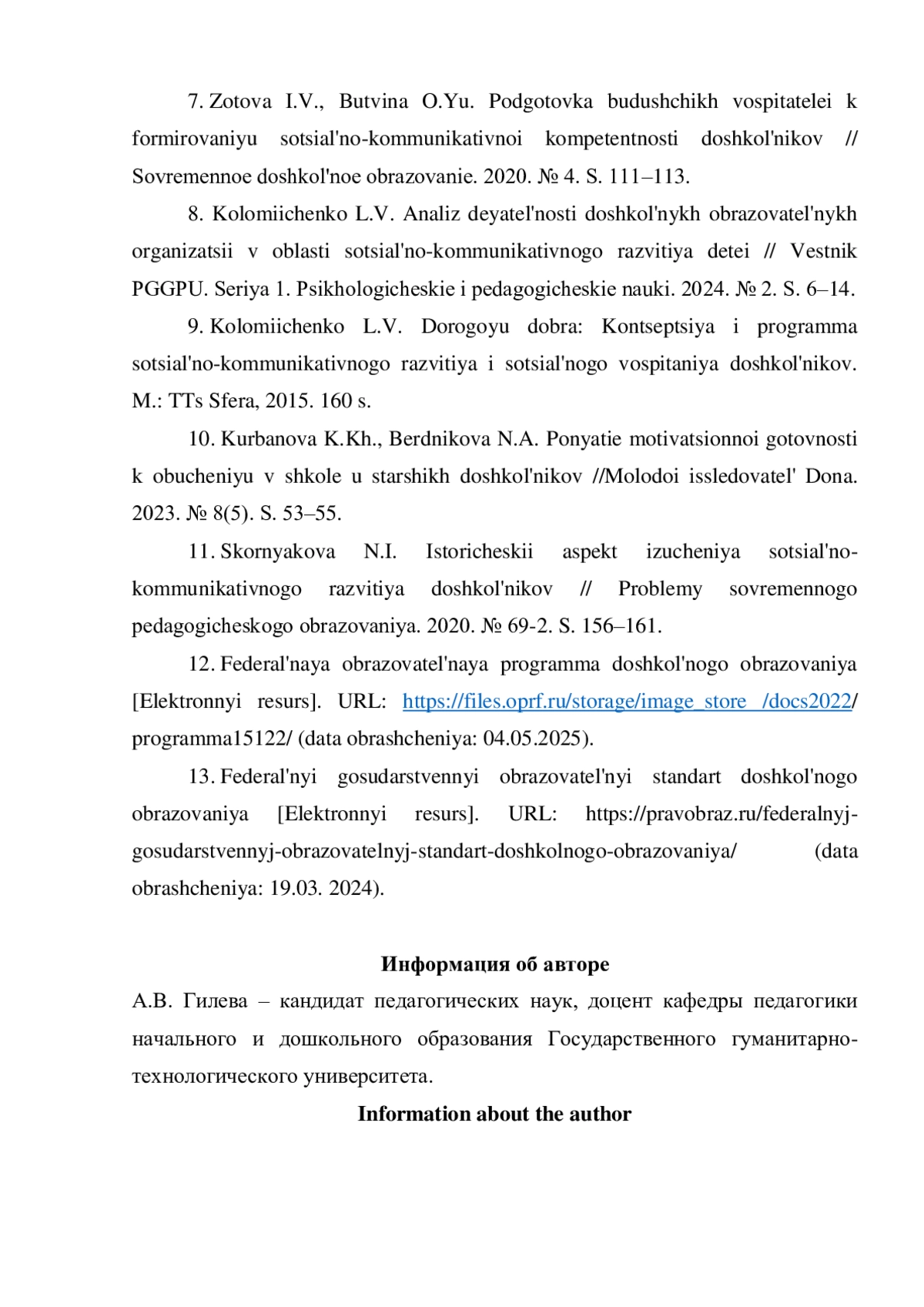3. Гилева А.В., Гилев Я.Ю. Социально-коммуникативное развитие детей дошкольного возраста как ценностная основа дошкольного образования // IХ Журавлевские чтения. Научно-педагогические основы проектирования личностно-созидающей стратегии образования“: материалы Международной научно-практической конференции. М., 2024. С. 113-117. EDN: TTITDK