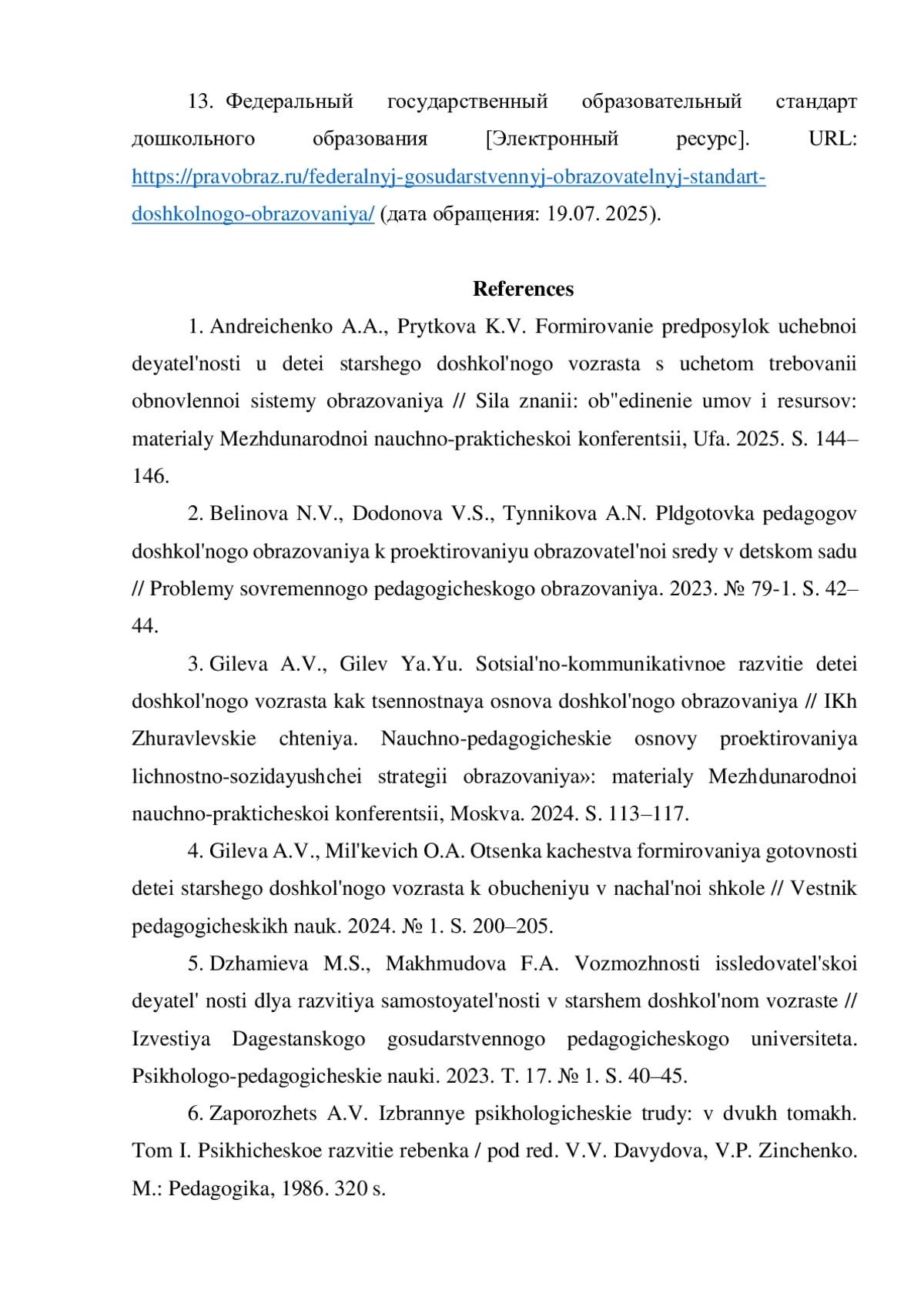 1. Андрейченко А.А., Прыткова К.В. Формирование предпосылок учебной деятельности у детей старшего дошкольного возраста с учетом требований обновленной системы образования // Сила знаний: объединение умов и ресурсов: материалы Международной научно-практической конференции, Уфа. 2025. С.144-146. EDN: LSRYYV