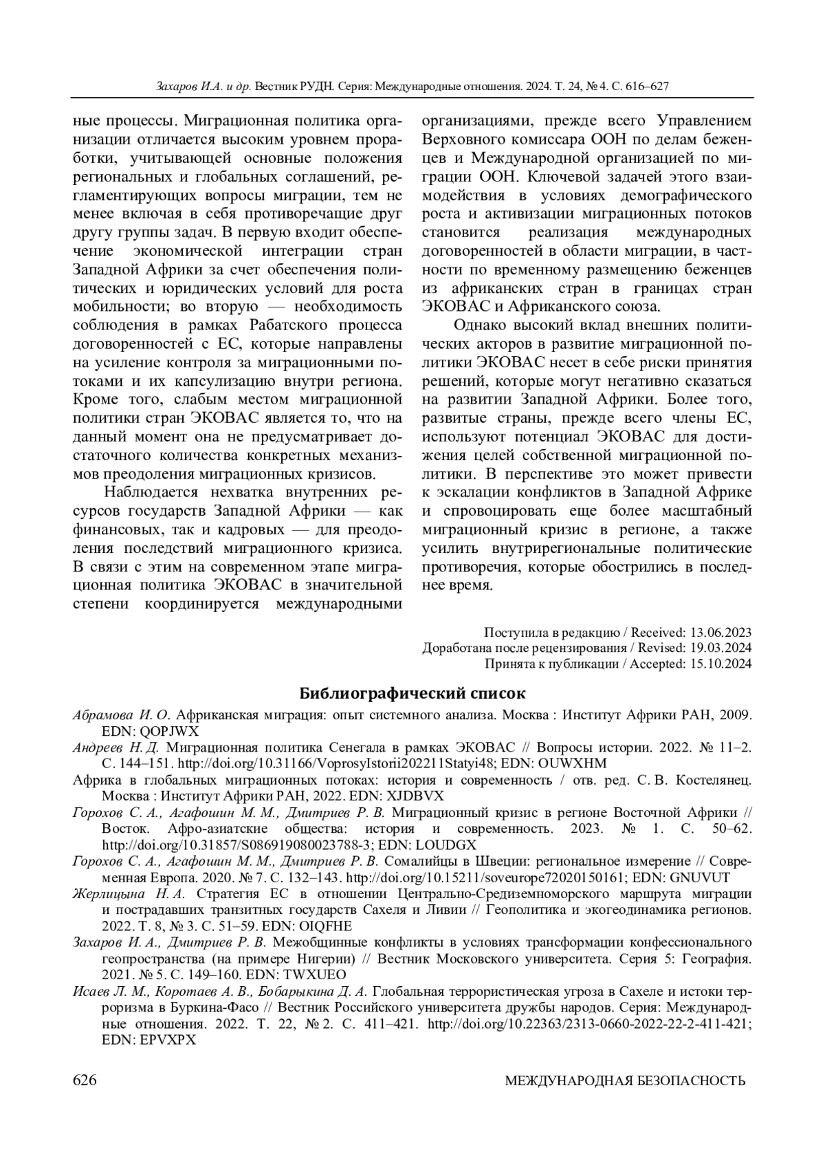 2. Андреев Н. Д. Миграционная политика Сенегала в рамках ЭКОВАС // Вопросы истории. 2022. № 11-2. С. 144-151. ;. DOI: 10.31166/VoprosyIstorii202211Statyi48 EDN: OUWXHM