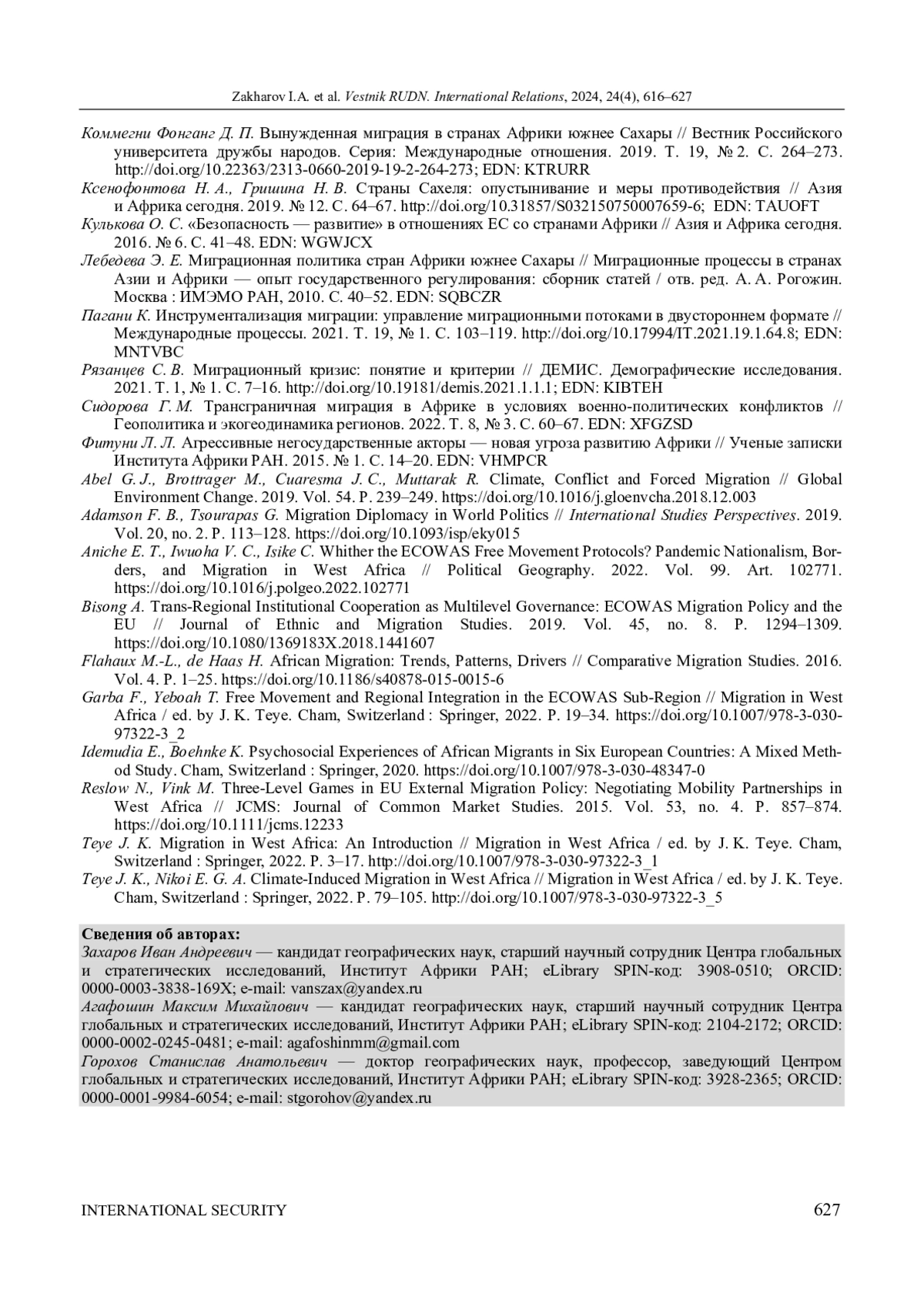 15. Сидорова Г. М. Трансграничная миграция в Африке в условиях военно-политических конфликтов // Геополитика и экогеодинамика регионов. 2022. Т. 8, № 3. С. 60-67. EDN: XFGZSD