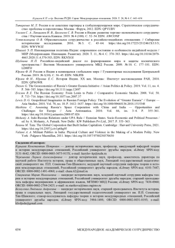 22. Lewis D. G. Geopolitical Imaginaries in Russian Foreign Policy: The Evolution of “Greater Eurasia” // Europe - Asia Studies. 2018. Vol. 70, no. 10. P. 1612-1637. DOI: 10.1080/09668136.2018.1515348 EDN: DWYYBJ
