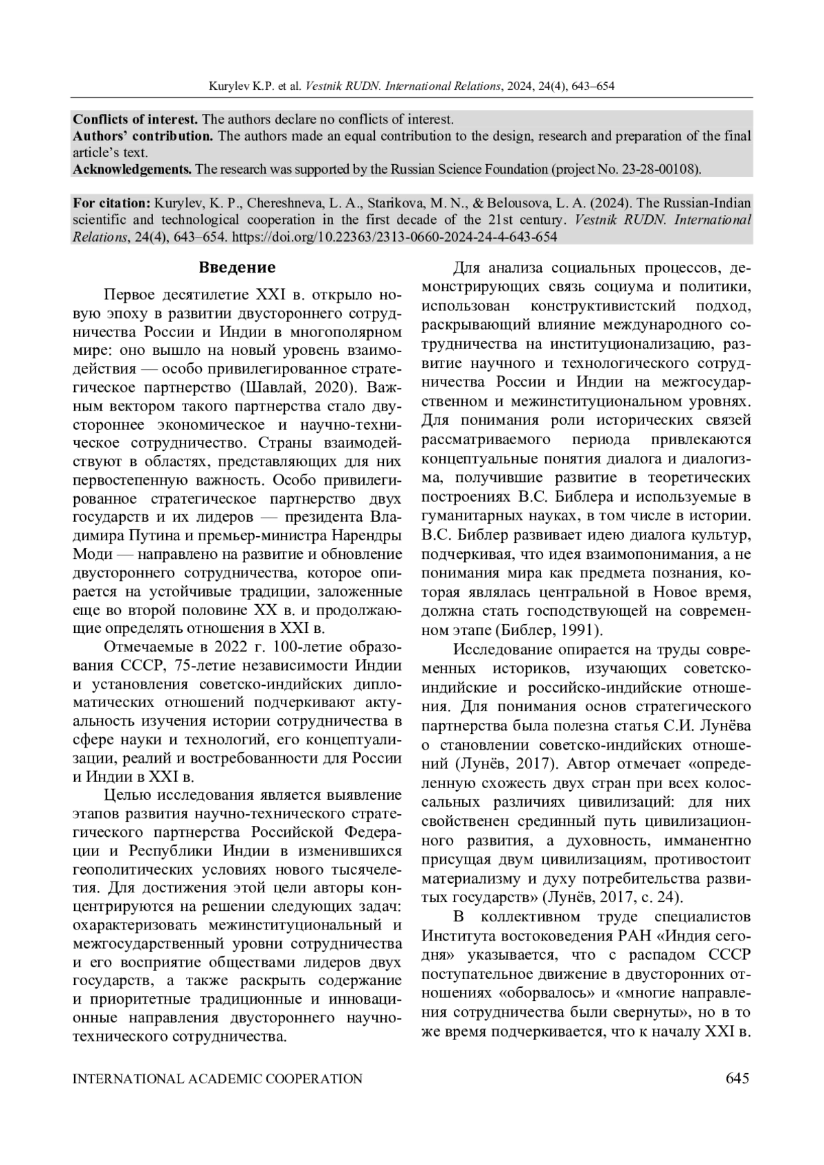 Цель исследования - охарактеризовать перспективы двусторонней кооперации России и Индии, начавшейся в XX в., в рамках культурно-цивилизационных аспектов системы межгосударственных отношений. Авторы анализируют проблемы повышения результативности сотрудничества двух стран на современном этапе, обусловленного необходимостью взаимодействия в научно-технологической, инновационной и образовательной сферах, для противодействия новым вызовам, связанным с техногенными, климатическими и социокультурными угрозами, а также терроризмом и религиозным экстремизмом. Предметом статьи является российско-индийское сотрудничество в научной и технологической сферах, его международная законодательная база и реальное наполнение. Для исследования социальных процессов, демонстрирующих связь социума и политики, использован конструктивистский подход, раскрывающий влияние международного сотрудничества на институционализацию, развитие научного и технологического сотрудничества СССР и Индии на межгосударственном и межинституциональном уровнях. При рассмотрении культурно-цивилизационной специфики России и Индии используются цивилизационный и модернизационный подходы. Авторы приходят к выводу, что сотрудничество России и Индии в научно-технической сфере является показательным примером межгосударственного взаимопонимания и дружбы в контексте современных геополитических процессов, согласуясь с национальными интересами обеих держав и их обществ.