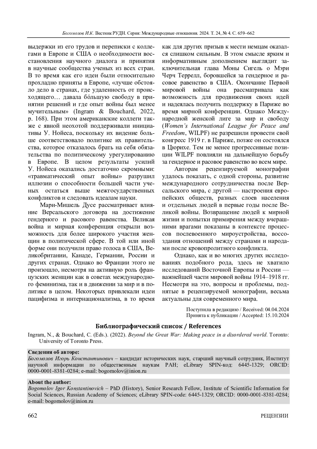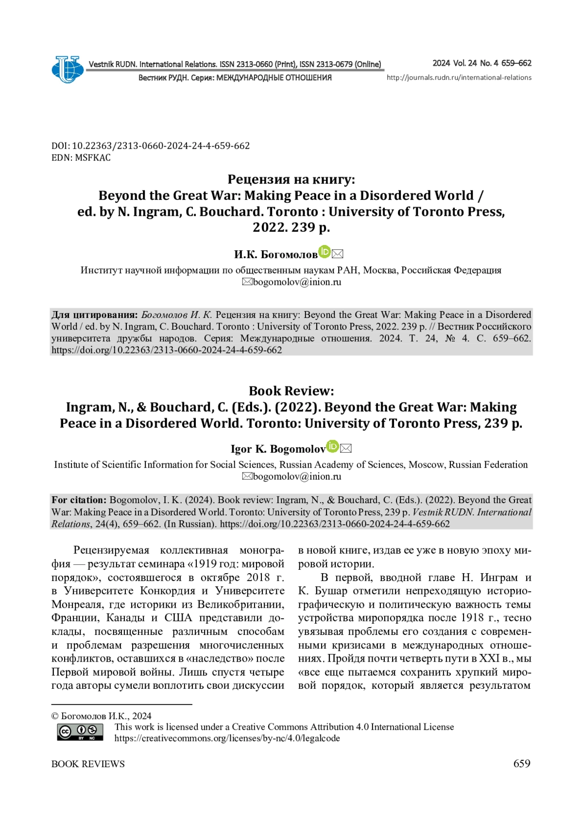 Для цитирования: Богомолов И. К. Рецензия на книгу: Beyond the Great War: Making Peace in a Disordered World / ed. by N. Ingram, C. Bouchard. Toronto: University of Toronto Press, 2022. 239 p. // Вестник Российского университета дружбы народов. Серия: Международные отношения. 2024. Т. 24, № 4. С. 659–662. https://doi. org/10.22363/2313-0660-2024-24-4-659-662
