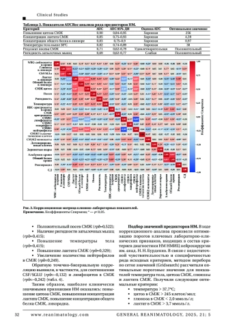 Результаты. При внешней валидации критериев диагностики НМ в анализируемой когорте пациентов чувствительность и специфичность по критериям CDC составили, соответственно, 81,67 и 83,33%. По критериям НМИЦ нейрохирургии им. акад. Н. Н. Бурденко эти показатели составили для вероятного НМ 81,67 и 88,33%, для подтвержденного НМ — 51,67 и 100%, соответственно. По критериям CDC наивысшую чувствительность выявили для показателя концентрации белка в спинномозговой жидкости (СМЖ)  0,33 г/л (83,6%), при крайне низкой специфичности — 21%, наивысшую специфичность — для результата посева СМЖ (100%). По критериям НМИЦ нейрохирургии им. акад. Н. Н. Бурденко для вероятного НМ наибольшую чувствительность демонстрировал показатель цитоза в СМЖ  65 клеток в мкл (64,4%), наибольшую специфичность — показатели концентрации глюкозы в ликворе  2,6 ммоль/л (93,9%) и CSF/SGLU  0,45 (96,8%). Для подтвержденного НМ максимальную чувствительность также демонстрировал показатель цитоза в СМЖ  65 клеток в мкл (95,2%), но специфичность этого признака составила только 51%. Наибольшую специфичность выявили для показателя лактата в СМЖ  4,2 ммоль/л (92,3%). Рассчитали оптимальные пороговые значения для 4-х показателей: температуры тела  37,7°C; цитоза в СМЖ  245 клеток/мкл; глюкозы СМЖ  2,0 ммоль/л и лактата СМЖ  3,7 ммоль/л. Использование комбинации пороговых значений всех 4-х показателей позволило достичь чувствительности 90,00% и специфичности 91,67%. Наибольшую диагностическую ценность имели показатели цитоза в СМЖ (AUC=0,90; 95% ДИ 0,84–0,95), повышенного лактата СМЖ (AUC=0,85; 95% ДИ 0,75–0,93), общего белка в СМЖ (AUC=0,83; 95% ДИ 0,75–0,90) и температуры тела (AUC=0,82; 95% ДИ 0,74–0,89). Показатели положительного посева СМЖ и наличия ригидности затылочных мышц коррелировали с диагнозом НМ (rbp=0,522 и rbp=0,415, соответственно, p=0,0001), однако не показали хорошей предиктивной диагностической способности.
