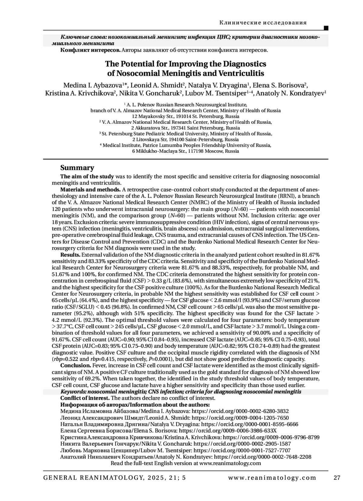ДРЯГИНА Н. В., АЙБАЗОВА М.И., ШМИДТ Л.А., БОРИСОВА Е.С., КРИВЧИКОВА К.А., ГОНЧАРУК Н.В., ЦЕНЦИПЕР Л. М., КОНДРАТЬЕВ А.Н. ВОЗМОЖНОСТИ СОВЕРШЕНСТВОВАНИЯ ДИАГНОСТИКИ НОЗОКОМИАЛЬНЫХ МЕНИНГИТОВ И ВЕНТРИКУЛИТОВ // ОБЩАЯ РЕАНИМАТОЛОГИЯ. 2025. № 5, ТОМ 21