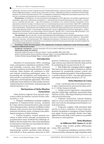 Заключение. Дельта-ритмы служат важнейшими биомаркерами состояний нарушенного сознания и представляют диагностическую, прогностическую и терапевтическую ценность. Мультимодальные подходы, объединяющие ЭЭГ, нейровизуализацию и механистические исследования, необходимы для углубления понимания и улучшения клинических результатов при лечении пациентов в состоянии нарушенного сознания.