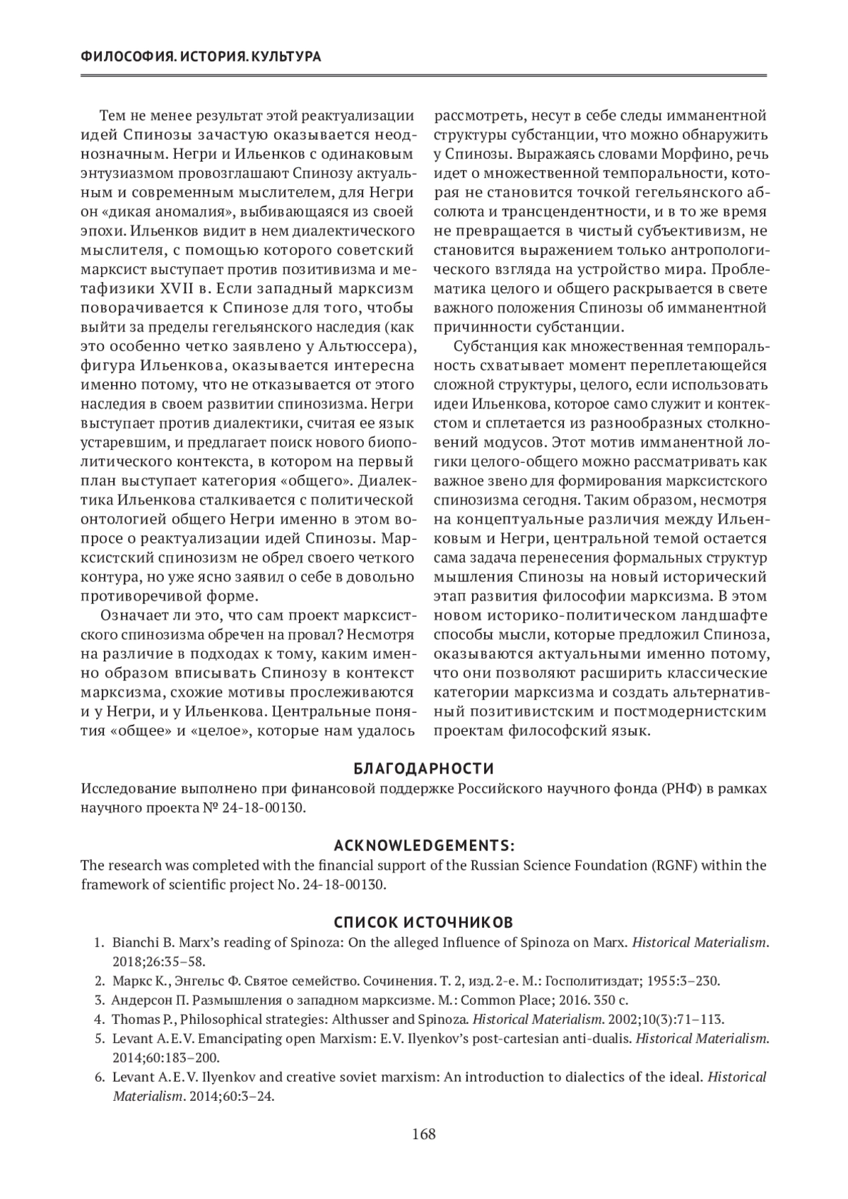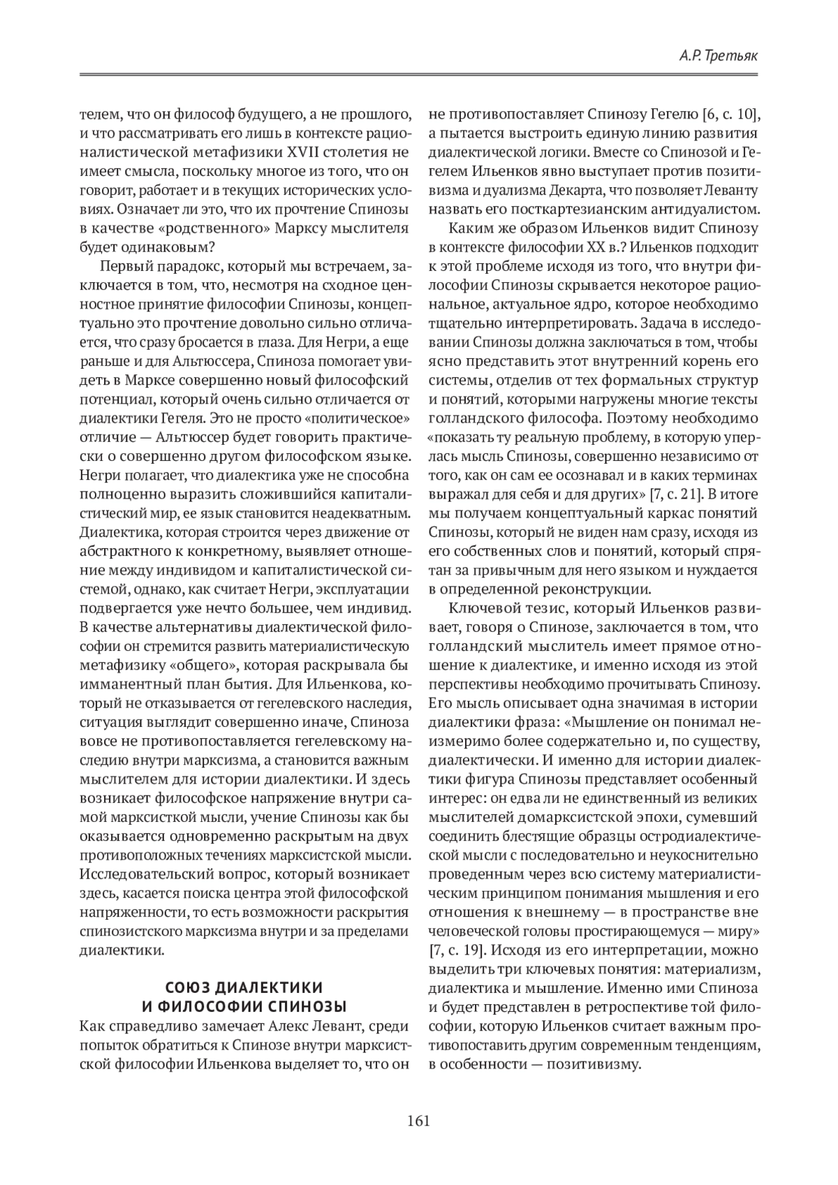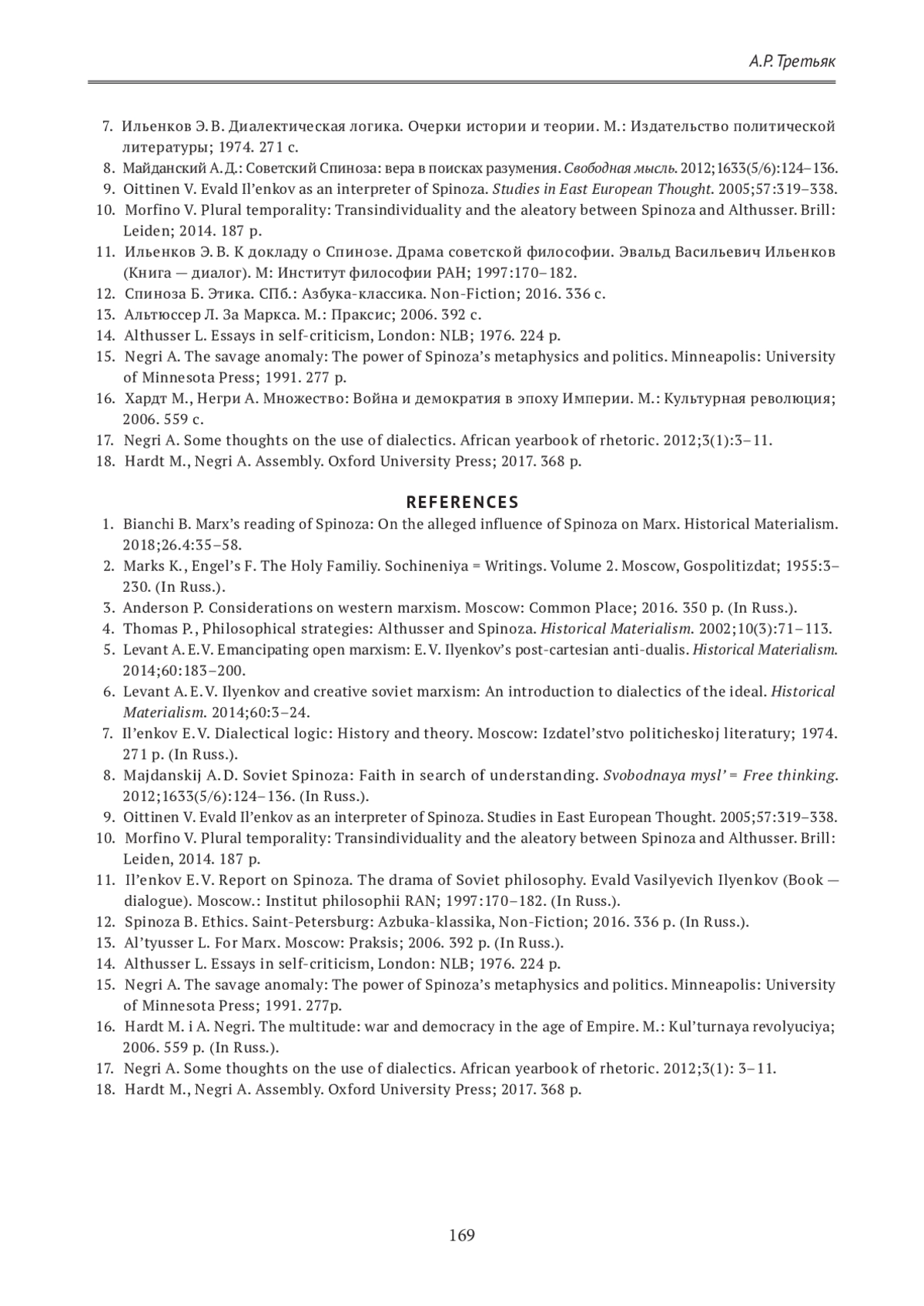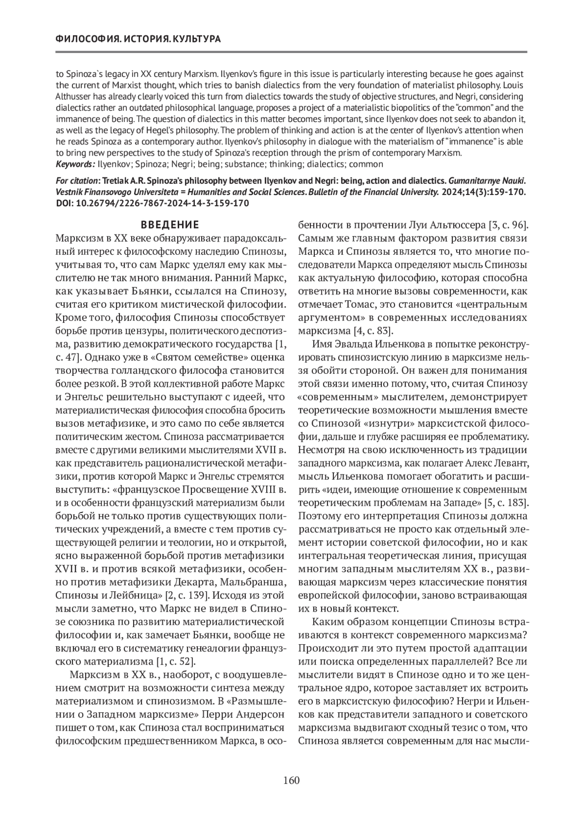 ТРЕТЬЯК А. Р. ФИЛОСОФИЯ СПИНОЗЫ МЕЖДУ ИЛЬЕНКОВЫМ И НЕГРИ: БЫТИЕ, ДЕЙСТВИЕ И ДИАЛЕКТИКА // ГУМАНИТАРНЫЕ НАУКИ. ВЕСТНИК ФИНАНСОВОГО УНИВЕРСИТЕТА. 2024. ТОМ 14, № 3
