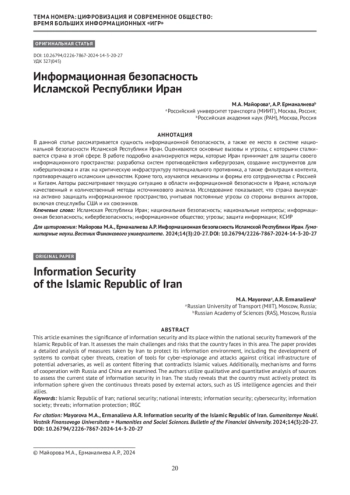 В данной статье рассматривается сущность информационной безопасности, а также ее место в системе национальной безопасности Исламской Республики Иран. Оцениваются основные вызовы и угрозы, с которыми сталкивается страна в этой сфере. В работе подробно анализируются меры, которые Иран принимает для защиты своего информационного пространства: разработка систем противодействия киберугрозам, создание инструментов для кибершпионажа и атак на критическую инфраструктуру потенциального противника, а также фильтрация контента, противоречащего исламским ценностям. Кроме того, изучаются механизмы и формы его сотрудничества с Россией и Китаем. Авторы рассматривают текущую ситуацию в области информационной безопасности в Иране, используя качественный и количественный методы источникового анализа. Исследование показывает, что страна вынуждена активно защищать информационное пространство, учитывая постоянные угрозы со стороны внешних акторов, включая спецслужбы США и их союзников.