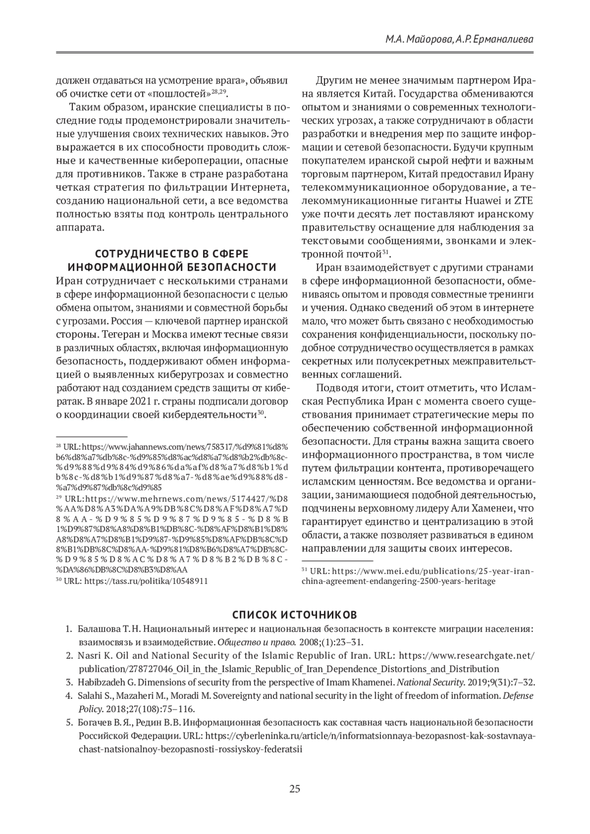 1. Балашова Т. Н. Национальный интерес и национальная безопасность в контексте миграции населения: взаимосвязь и взаимодействие. Общество и право. 2008;(1):23-31.