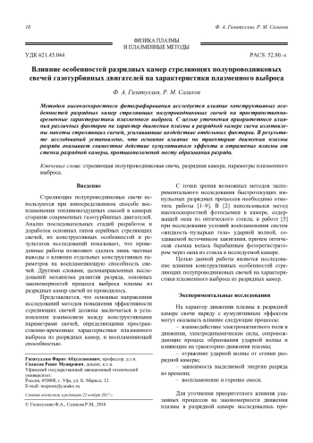 Влияние особенностей разрядных камер стреляющих полупроводниковых свечей газотурбинных двигателей на характеристики плазменного выброса Гизатуллин Ф. А., Салихов Р. М. 10