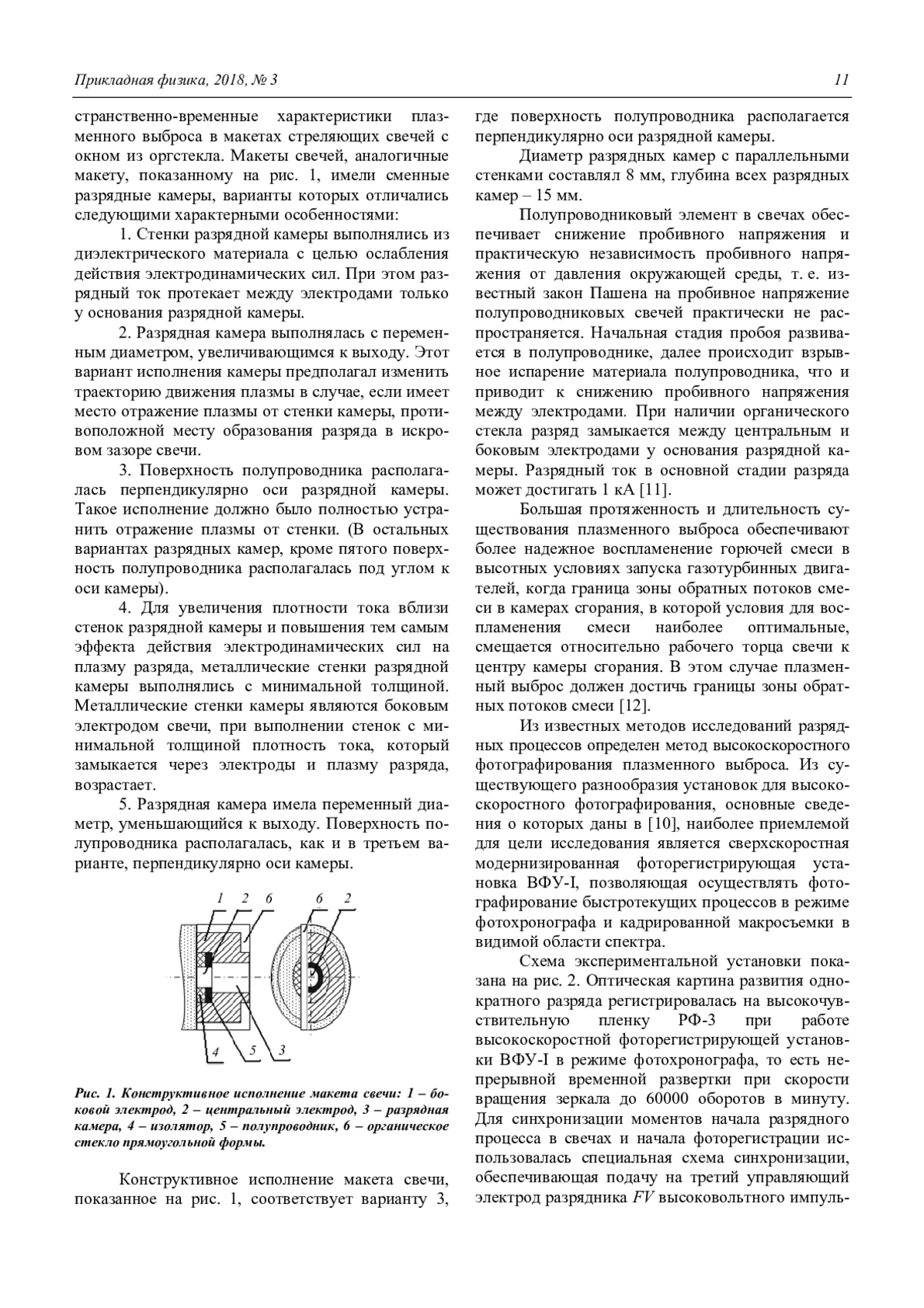 Методом высокоскоростного фотографирования исследуется влияние конструктивных особенностей разрядных камер стреляющих полупроводниковых свечей на пространственновременные характеристики плазменного выброса. С целью уточнения приоритетного влияния различных факторов на характер движения плазмы в разрядной камере свечи изготовлены макеты стреляющих свечей, усиливающие воздействие отдельных факторов. В результате исследований установлено, что основное влияние на траекторию движения плазмы разряда оказывает совместное действие кумулятивного эффекта и отражение плазмы от стенки разрядной камеры, противоположной месту образования разряда.