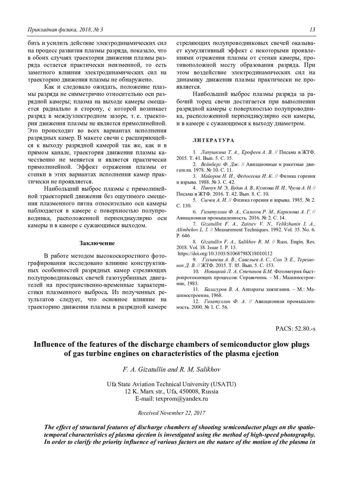 Influence of the features of the discharge chambers of semiconductor glow plugs of gas turbine engines on characteristics of the plasma ejection F. A. Gizatullin and R. M. Salikhov 10