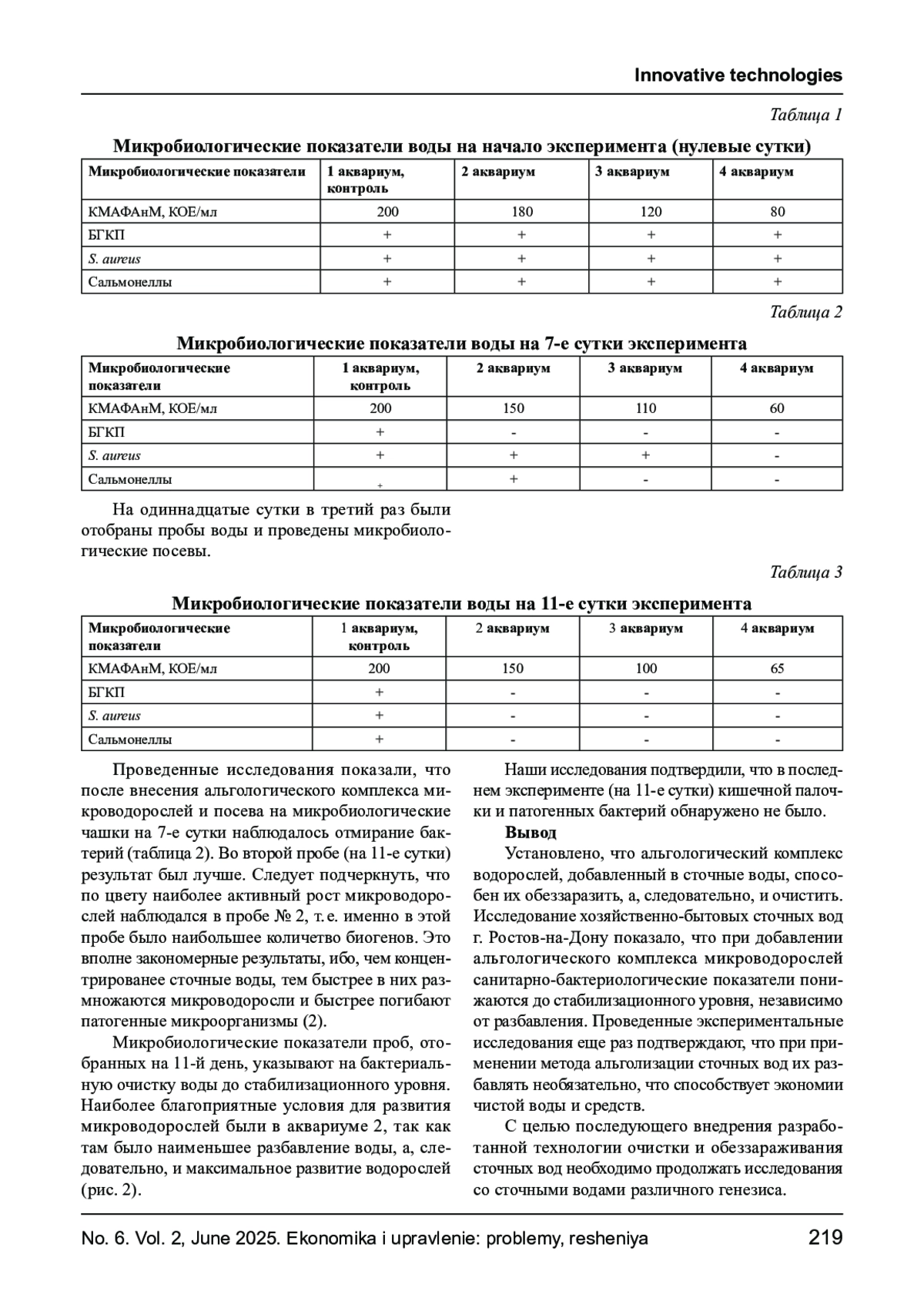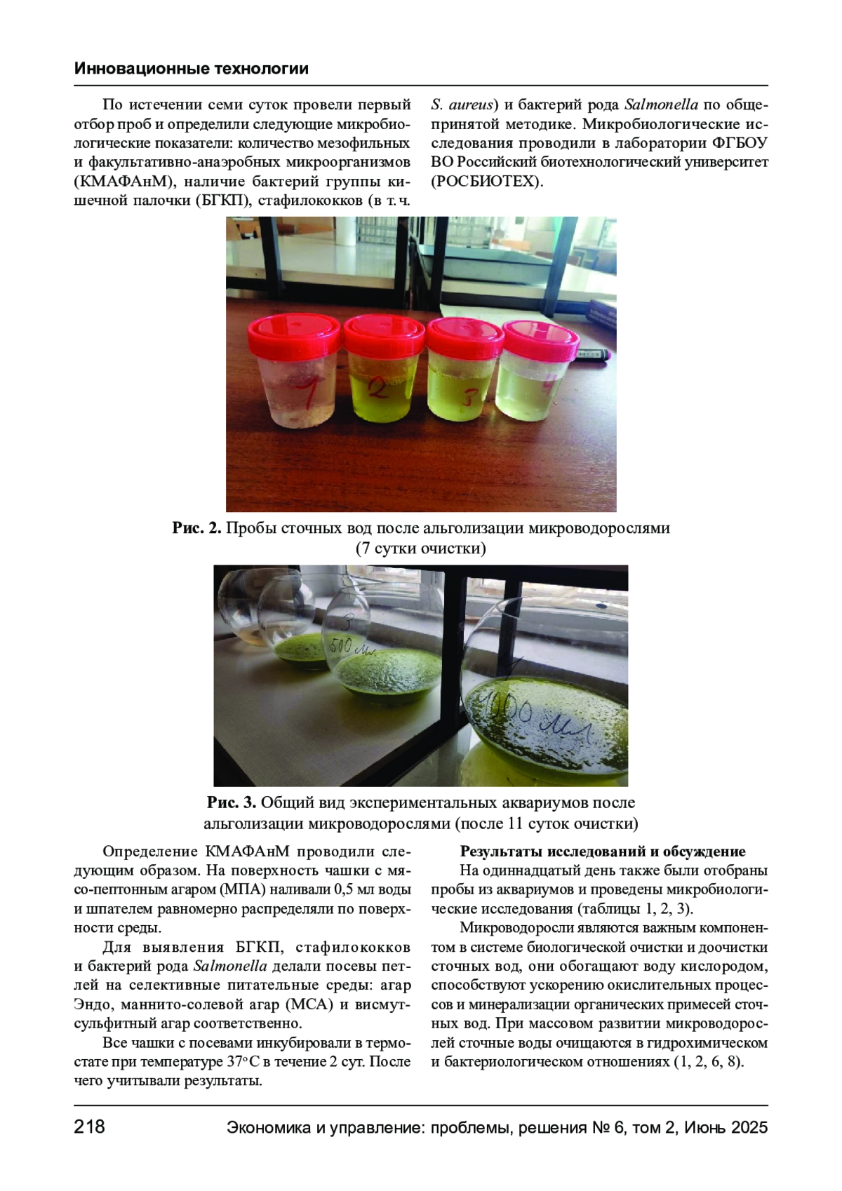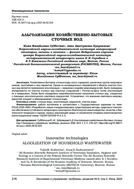 Хозяйственно - бытовые сточные воды могут содержать различные группы микроорганизмов, простейших и яиц паразитов. Одним из инновационных направлений в области очистки сточных вод является применение альголизации - введение в водоём микроводорослей. Были проведены эксперименты по очистке сточных вод очистных сооружений г. Ростов - на - Дону путем альголизации их в аквариумах. Затем были определены микробиологические показатели сточных вод, очищенных с помощью альгологического комплекса водорослей. Установлено, что внесение комплекса микроводорослей очищает и обеззараживает сточные воды.