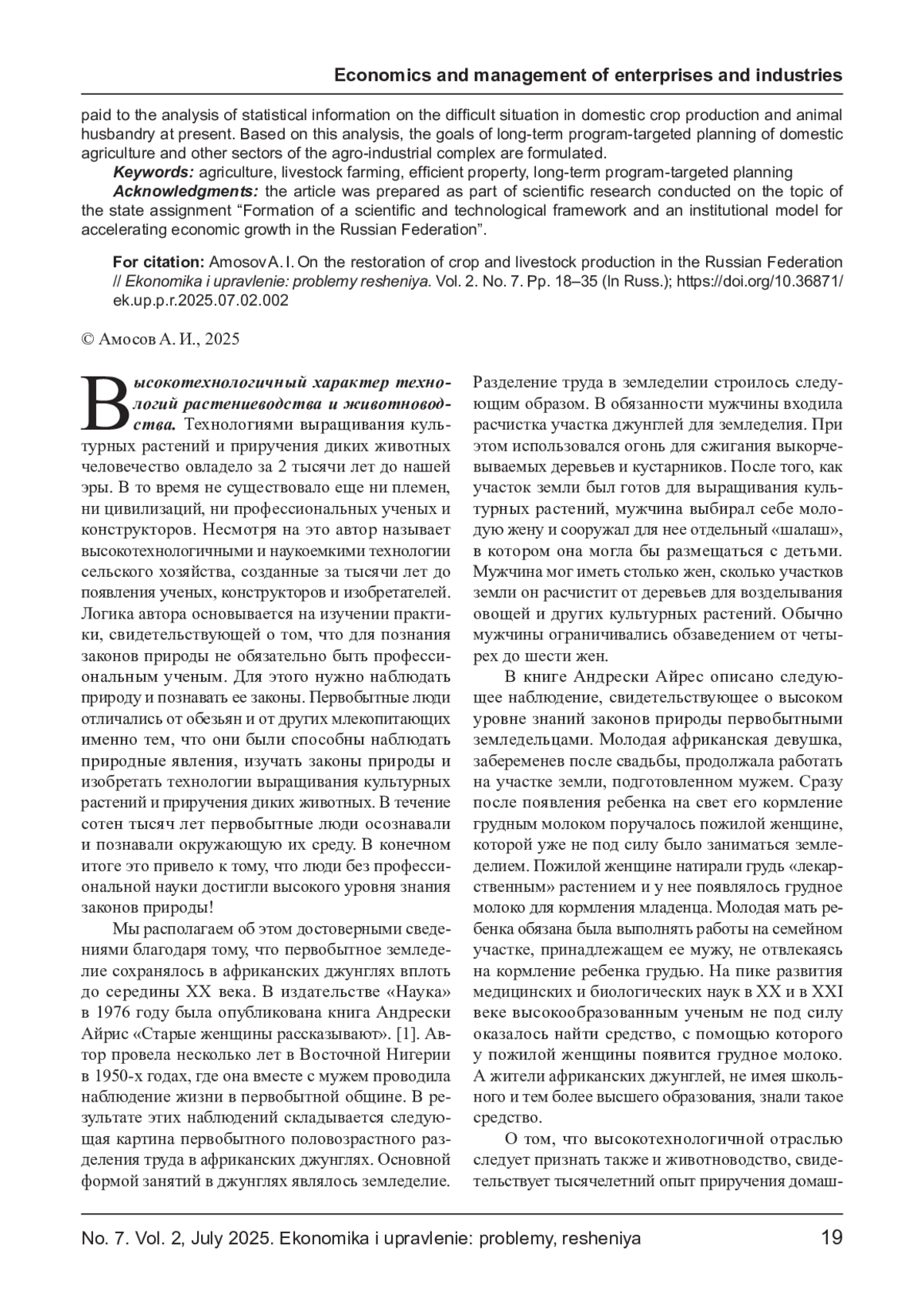 В статье обосновывается точка зрения, согласно которой растениеводство и животноводство относятся к наукоемким и высокотехнологичным видам деятельности, созданным в тысячелетия неолитической революции на основе изучения законов природы с использованием природного разума человека. Автор уделяет внимание ключевым моментам в развитии отечественного земледелия и землепользования в восемнадцатом и девятнадцатом веках, включая Столыпинские реформы 1906-1914 годов, связанные с попыткой перехода к фермерским хозяйствам. В статье сопоставляется опыт индустриализации сельского хозяйства двух мировых сверхдержав США и СССР. Формулируются критерии оценки эффективности индустриальных технологий в сельском хозяйстве. Особое внимание уделяется анализу статистической информации о сложной ситуации в отечественном растениеводстве и животноводстве в настоящее время. На основании этого анализа сформулированы цели долгосрочного программно-целевого планирования отечественного сельского хозяйства и других отраслей агропромышленного комплекса.