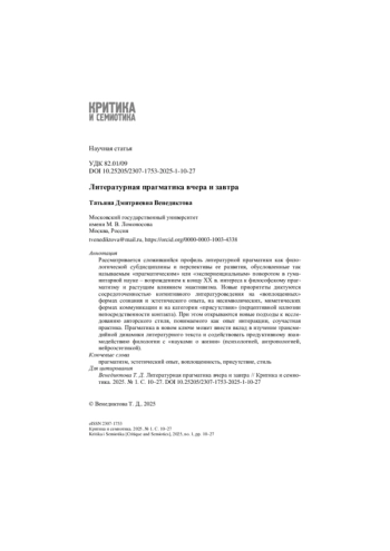 Рассматривается сложившийся профиль литературной прагматики как филологической субдисциплины и перспективы ее развития, обусловленные так называемым «прагматическим» или «экспериенциальным» поворотом в гуманитарной науке – возрождением к концу ХХ в. интереса к философскому прагматизму и растущим влиянием энактивизма. Новые приоритеты диктуются сосредоточенностью когнитивного литературоведения на «воплощенных» формах сознания и эстетического опыта, на несимволических, миметических формах коммуникации и на категории «присутствия» (перцептивной иллюзии непосредственности контакта). При этом открываются новые подходы к исследованию авторского стиля, понимаемого как опыт интеракции, соучастная практика. Прагматика в новом ключе может внести вклад в изучение трансмедийной динамики литературного текста и содействовать продуктивному взаимодействию филологии с «науками о жизни» (психологией, антропологией, нейроэстетикой).