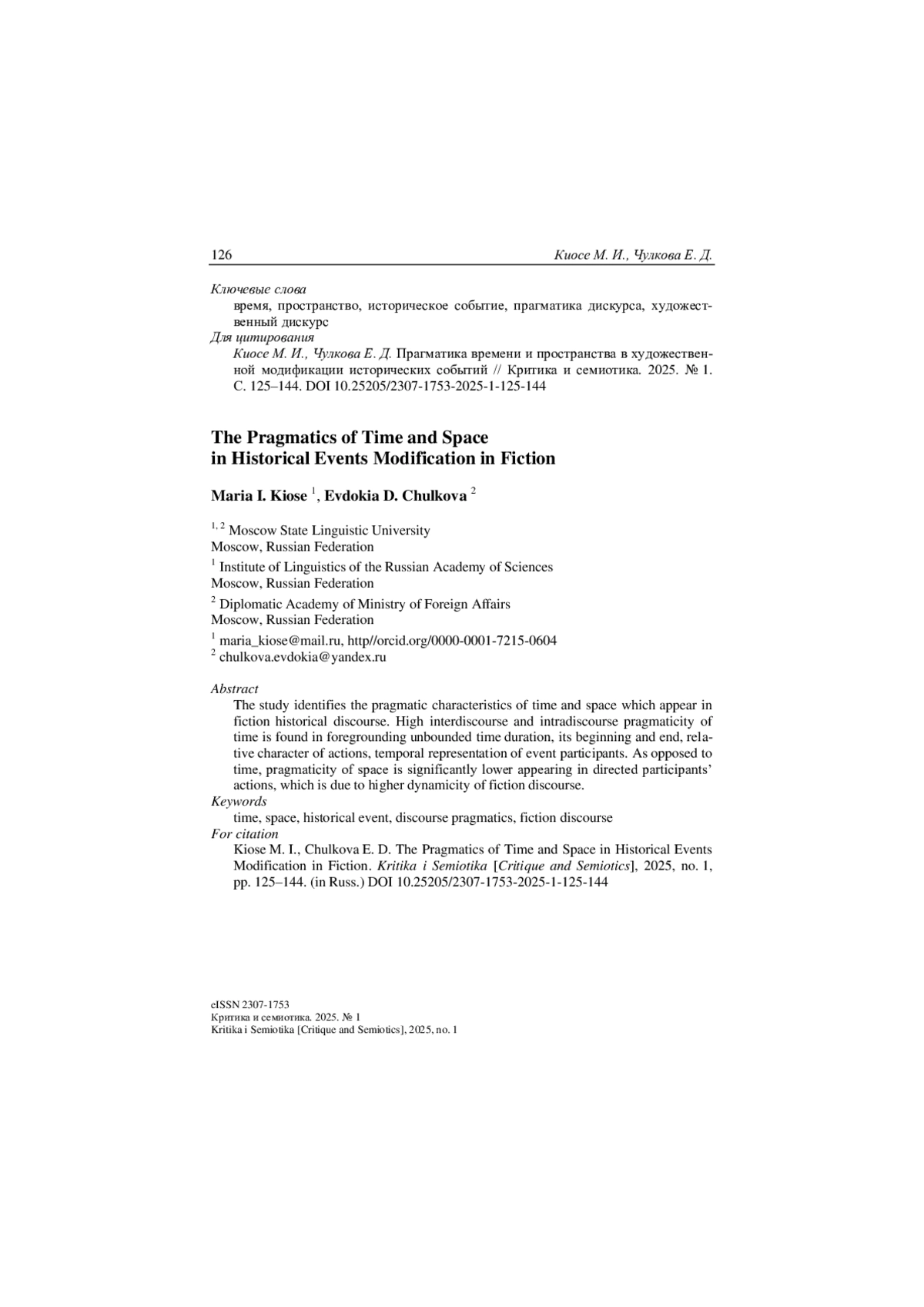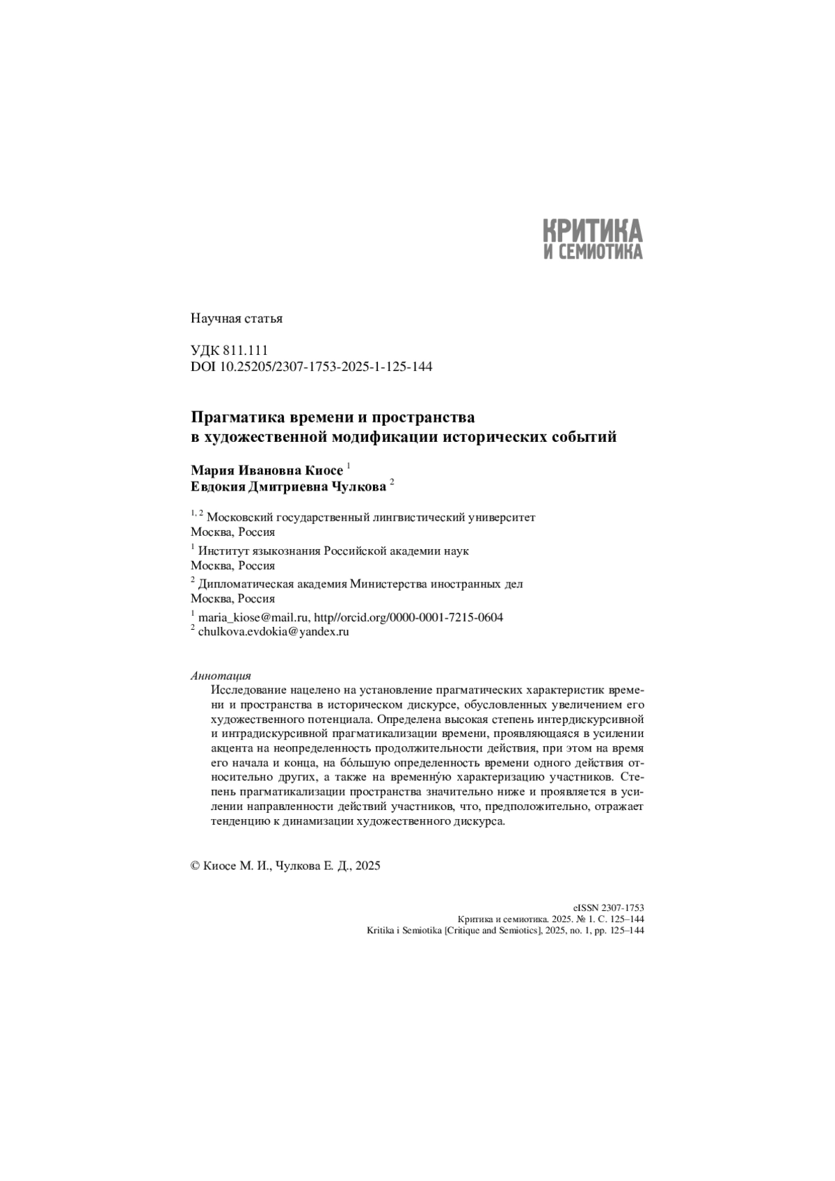 4. Зыкова И. В., Киосе М. И. Параметризация лингвистической креативности в междискурсивном аспекте: кинодискурс vs дискурс детской литературы // Вопросы когнитивной лингвистики. 2020. № 2. С. 26-40.