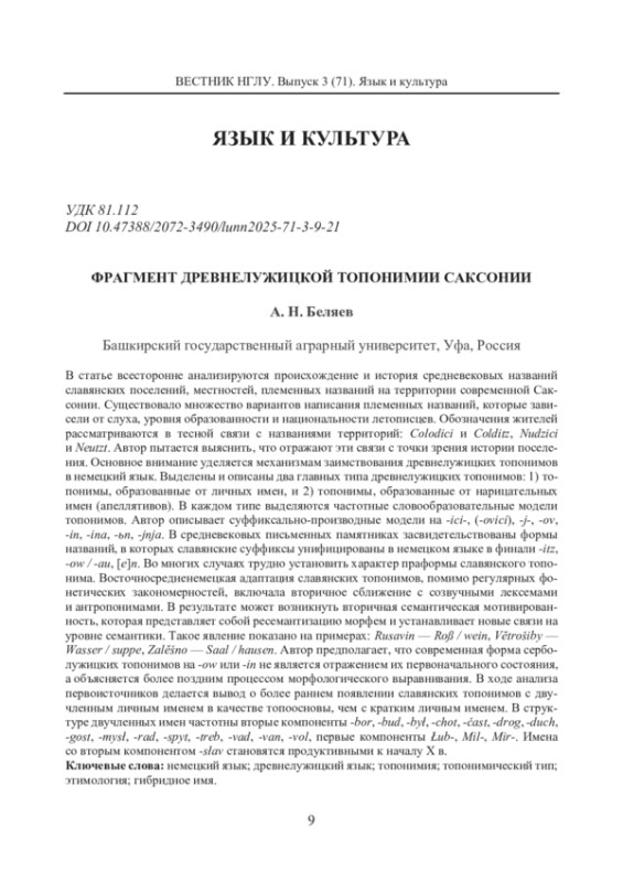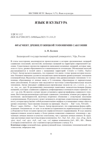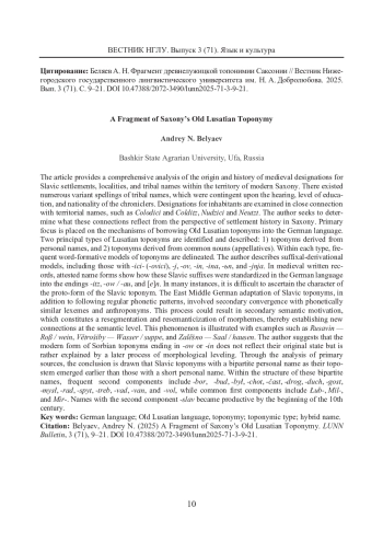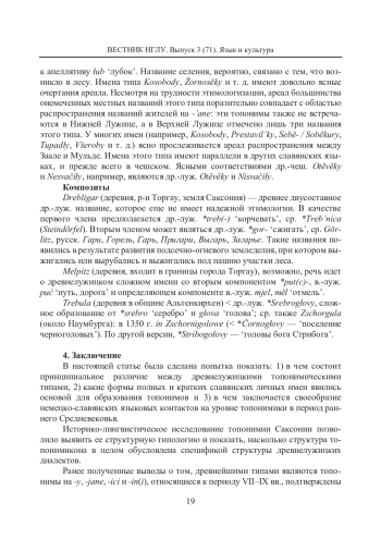В статье всесторонне анализируются происхождение и история средневековых названий славянских поселений, местностей, племенных названий на территории современной Саксонии. Существовало множество вариантов написания племенных названий, которые зависели от слуха, уровня образованности и национальности летописцев. Обозначения жителей рассматриваются в тесной связи с названиями территорий: Colodici и Colditz, Nudzici и Neutzt. Автор пытается выяснить, что отражают эти связи с точки зрения истории поселения. Основное внимание уделяется механизмам заимствования древнелужицких топонимов в немецкий язык. Выделены и описаны два главных типа древнелужицких топонимов: 1) топонимы, образованные от личных имен, и 2) топонимы, образованные от нарицательных имен (апеллятивов). В каждом типе выделяются частотные словообразовательные модели топонимов. Автор описывает суффиксально-производные модели на -ici-, ( -ovici ), -j-, -ov, -in, -ina, -ьn, -jnja. В средневековых письменных памятниках засвидетельствованы формы названий, в которых славянские суффиксы унифицированы в немецком языке в финали -itz, -ow / -au, [ e ] n. Во многих случаях трудно установить характер праформы славянского топонима. Восточносредненемецкая адаптация славянских топонимов, помимо регулярных фонетических закономерностей, включала вторичное сближение с созвучными лексемами и антропонимами. В результате может возникнуть вторичная семантическая мотивированность, которая представляет собой ресемантизацию морфем и устанавливает новые связи на уровне семантики. Такое явление показано на примерах: Rusavin - Roß / wein, Vĕtrošiby - Wasser / suppe, Zalĕšno - Saal / hausen. Автор предполагает, что современная форма серболужицких топонимов на -ow или -in не является отражением их первоначального состояния, а объясняется более поздним процессом морфологического выравнивания. В ходе анализа первоисточников делается вывод о более раннем появлении славянских топонимов с двучленным личным именем в качестве топоосновы, чем с кратким личным именем. В структуре двучленных имен частотны вторые компоненты -bor, -bud, -był, -chot, -čast, -drog, -duch, -gost, -mysł, -rad, -spyt, -treb, -vad, -van, -vol, первые компоненты Łub-, Mil-, Mir-. Имена со вторым компонентом -słav становятся продуктивными к началу Х в.