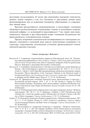2. Васильев В. Л. Специфика топонимического субстрата на исторических землях Новгорода и Пскова // Восточная Европа в древности и средневековье. М., 2025. Т. 37. С. 32-36. EDN: HCYOOL