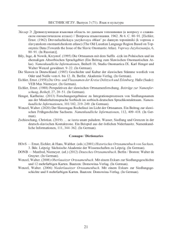7. Эйхлер Э. Древнелужицкая языковая область по данным топонимики (к вопросу о славянском ономастическом атласе) // Вопросы языкознания. 1962. № 6. С. 80-91.